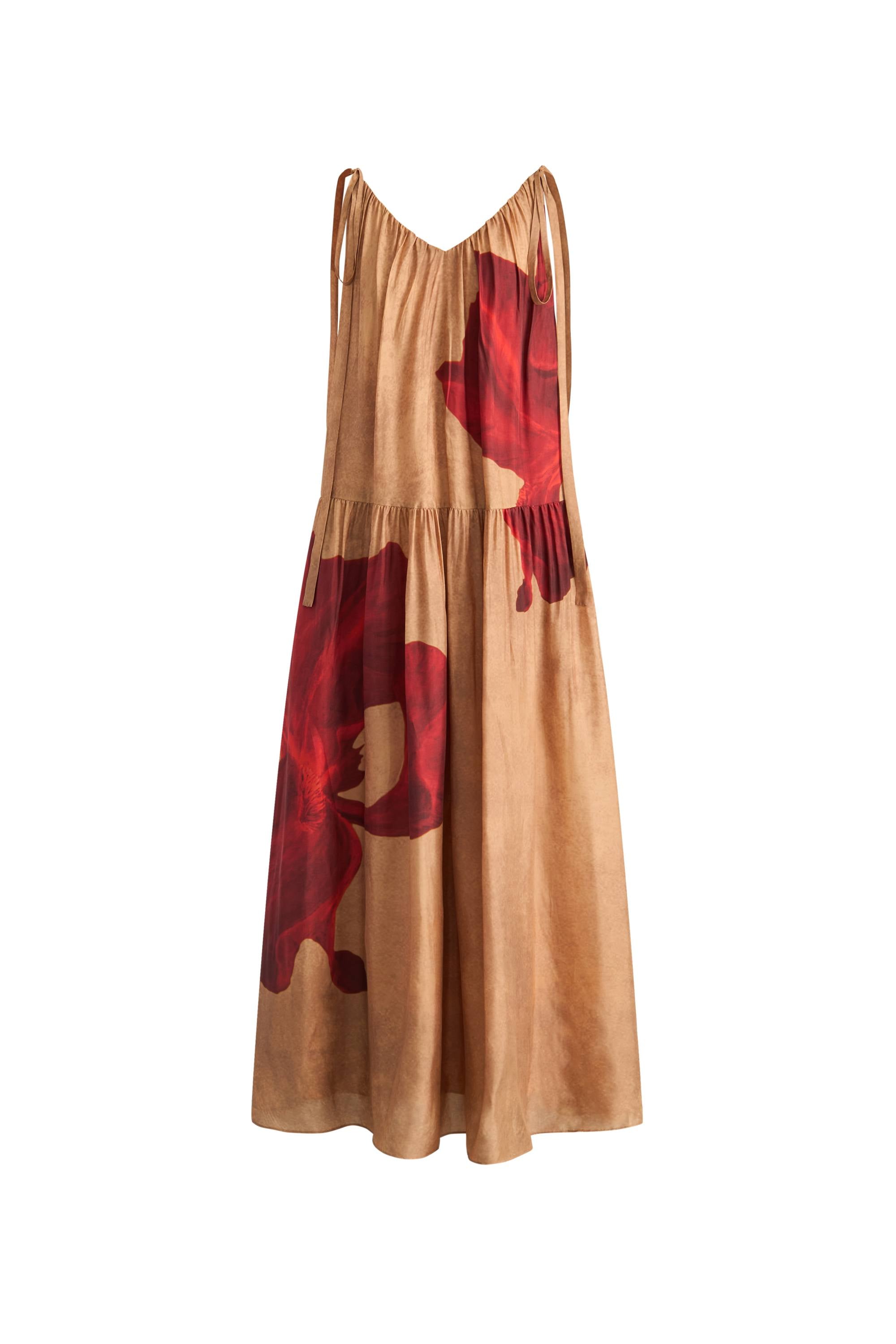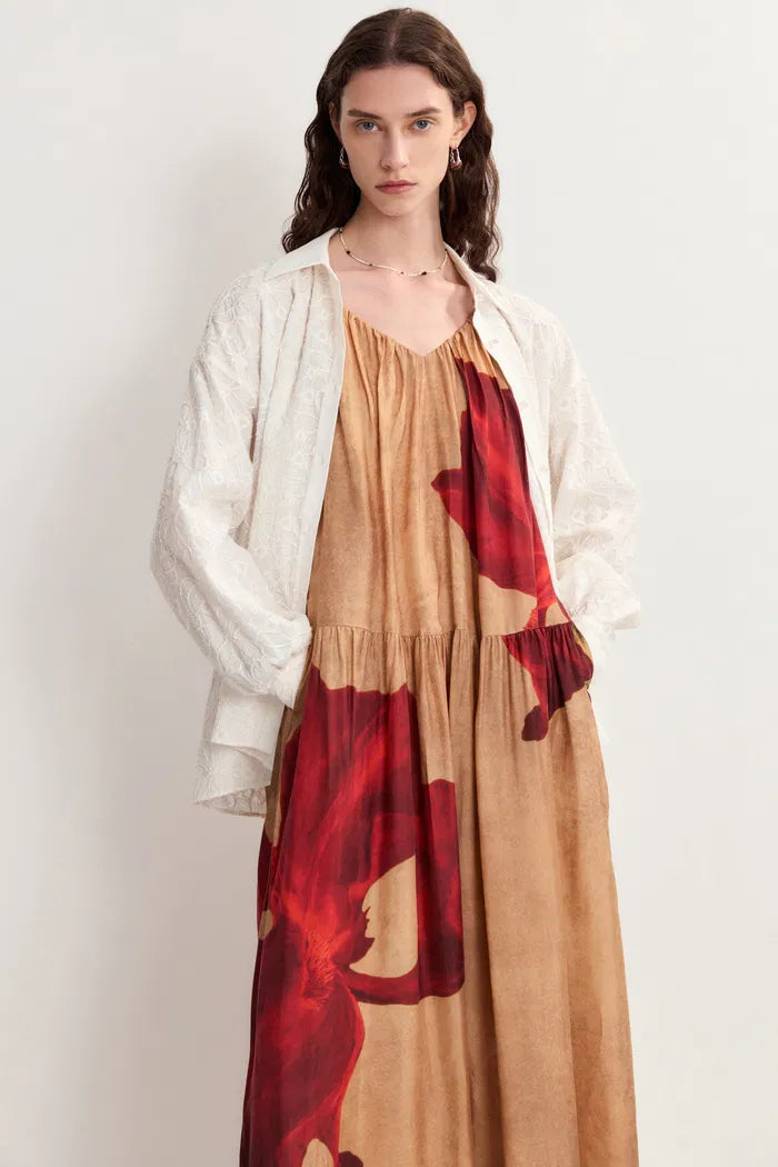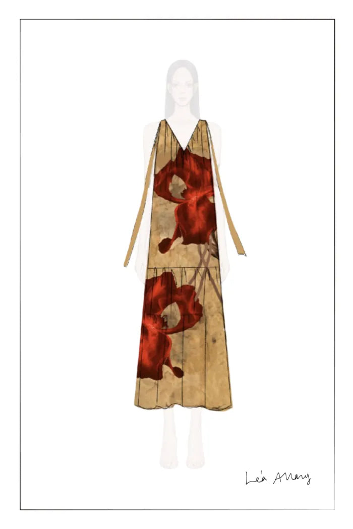 A dramatic V-neckline and playful bow-tied straps make this printed dress a standout piece. The loose-fitting silhouette flows beautifully with movement, while the lyocell fabric ensures lightweight comfort. The designer's hand-painted iris flowers and botanical dyeing techniques add artistic dimension.