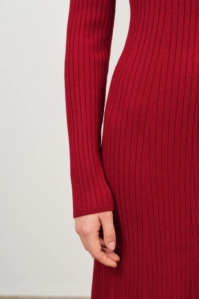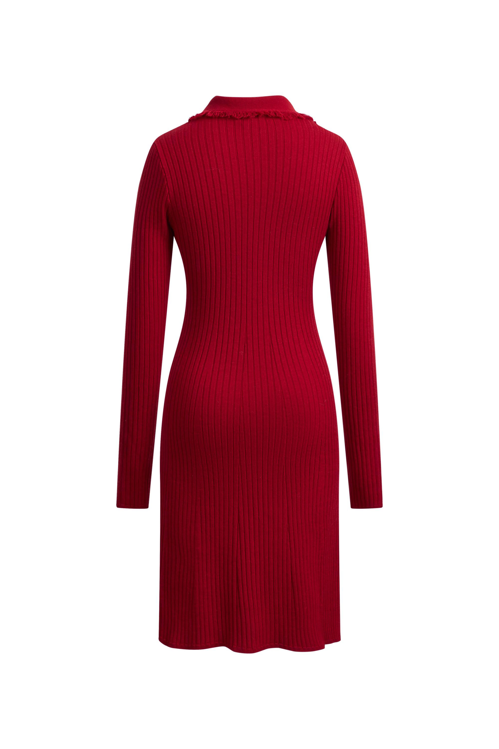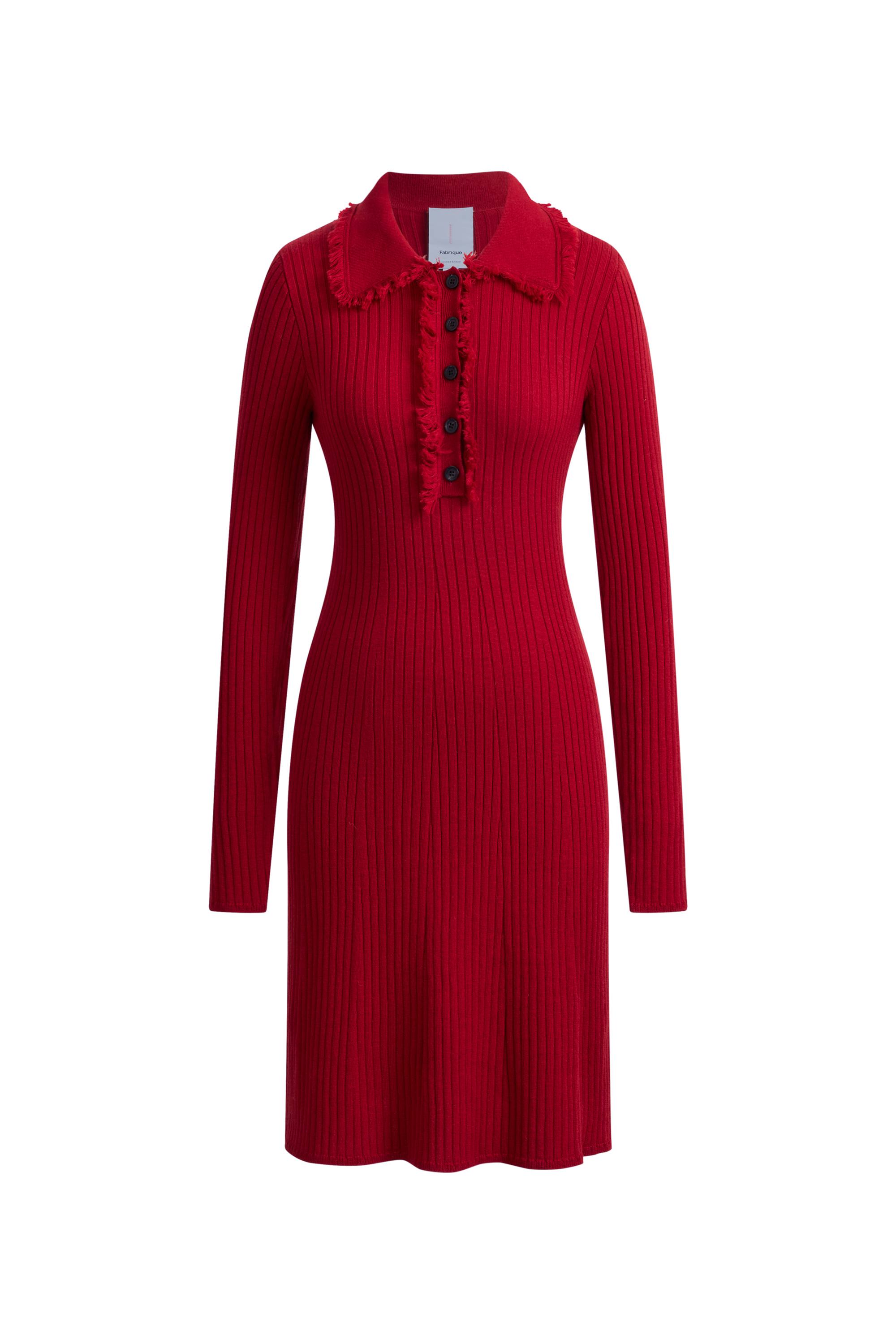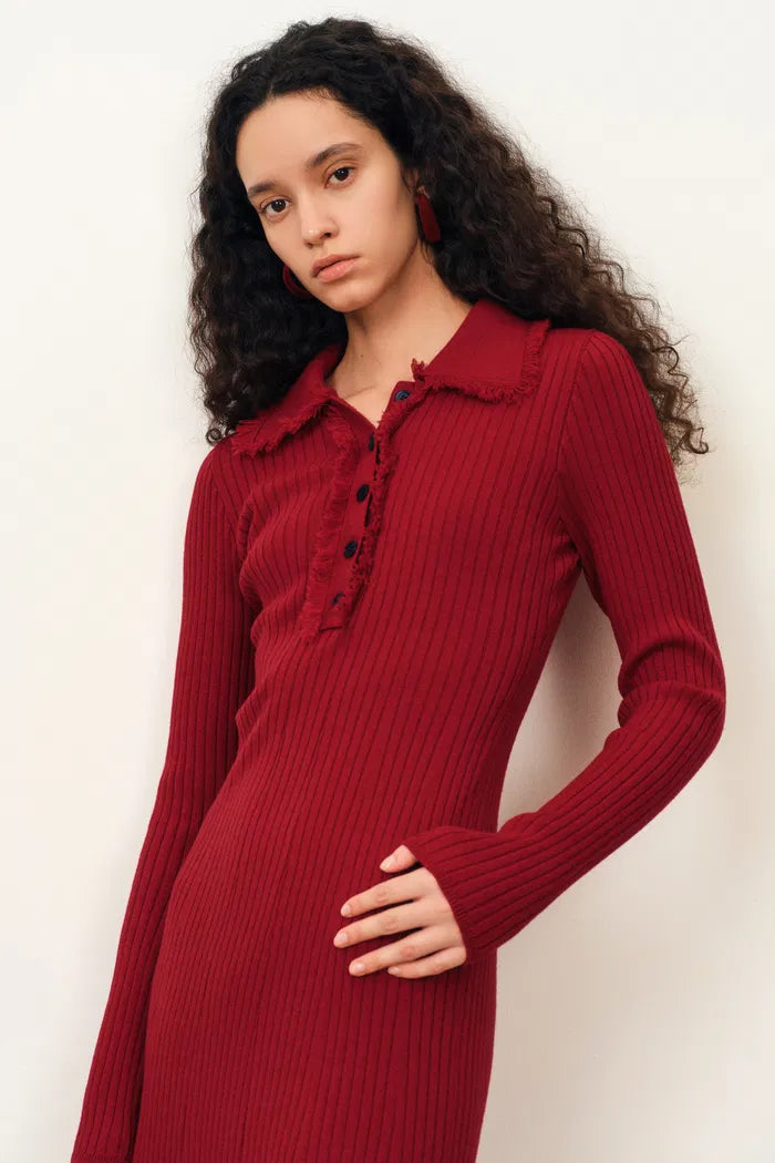 A study in movement and form. This Merino wool dress sculpts the body through shifting rib lines that contour and elongate. The tasseled polo collar introduces texture and ease, bringing subtle contrast to the refined, curve-tracing silhouette.