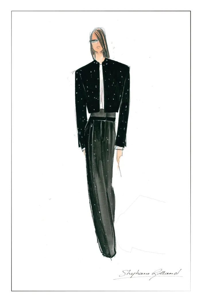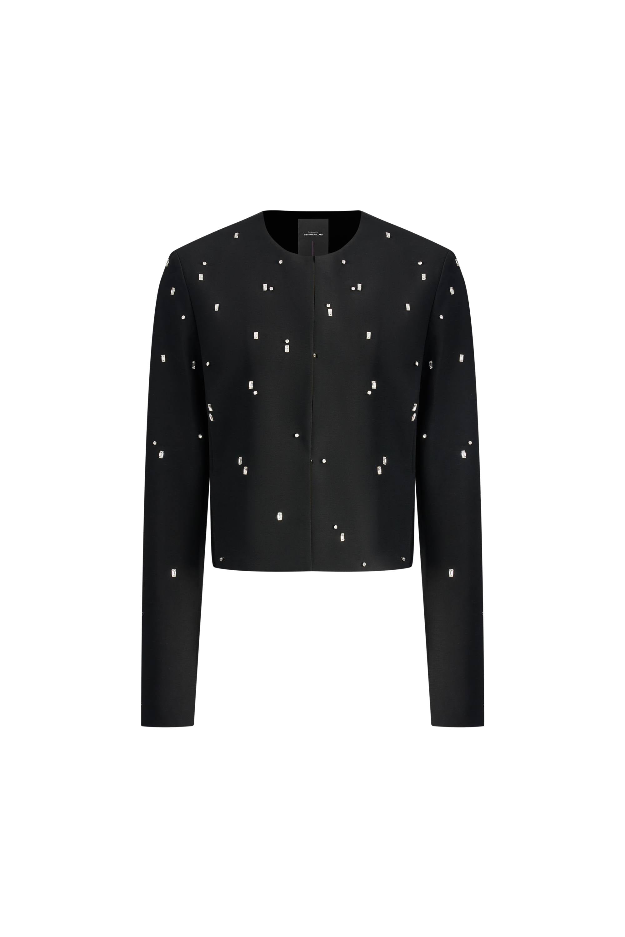Sixty rhinestones create starlight pattern while cropped proportions work perfectly with high-waisted bottoms. French construction techniques ensure luxury finishing while the shortened length maintains contemporary appeal.