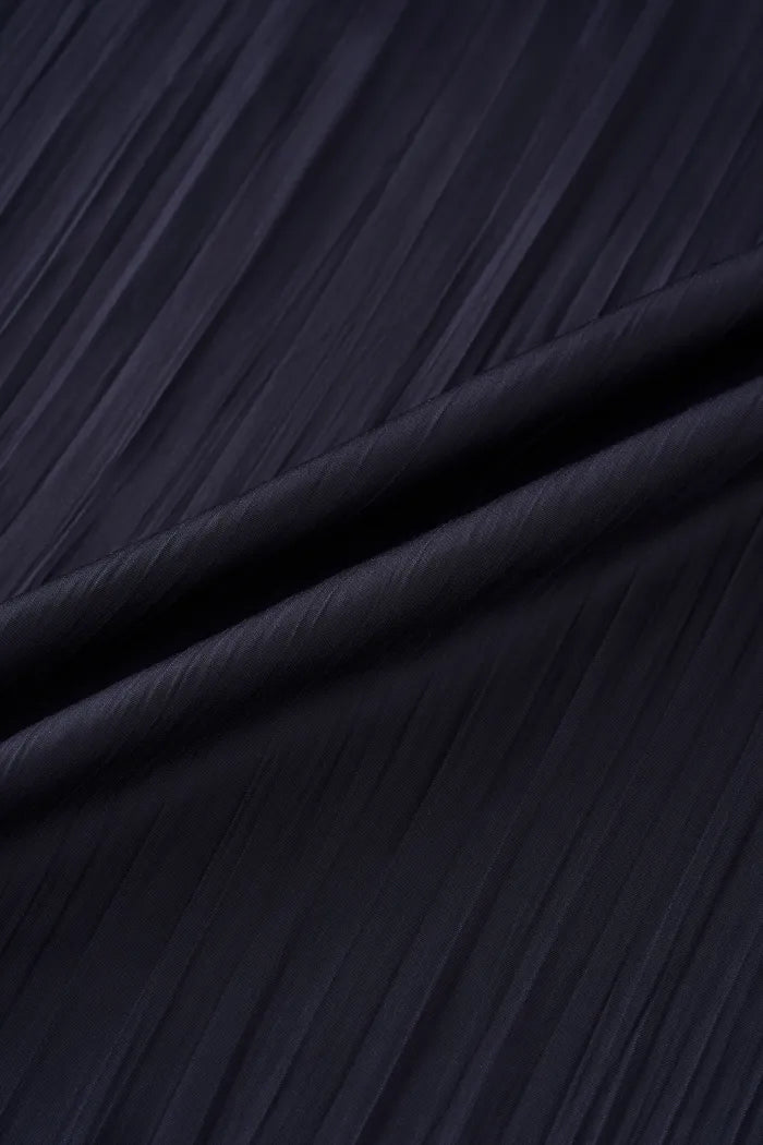 High-density satin enhanced with irregular pleating that creates midnight wave-like texture. Pleats have natural stretch that follows body curves without restriction. Lightweight and cooling against skin for comfortable wear. Textural, flowing, comfortable.