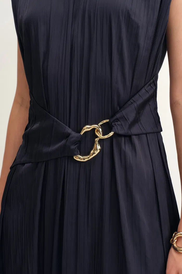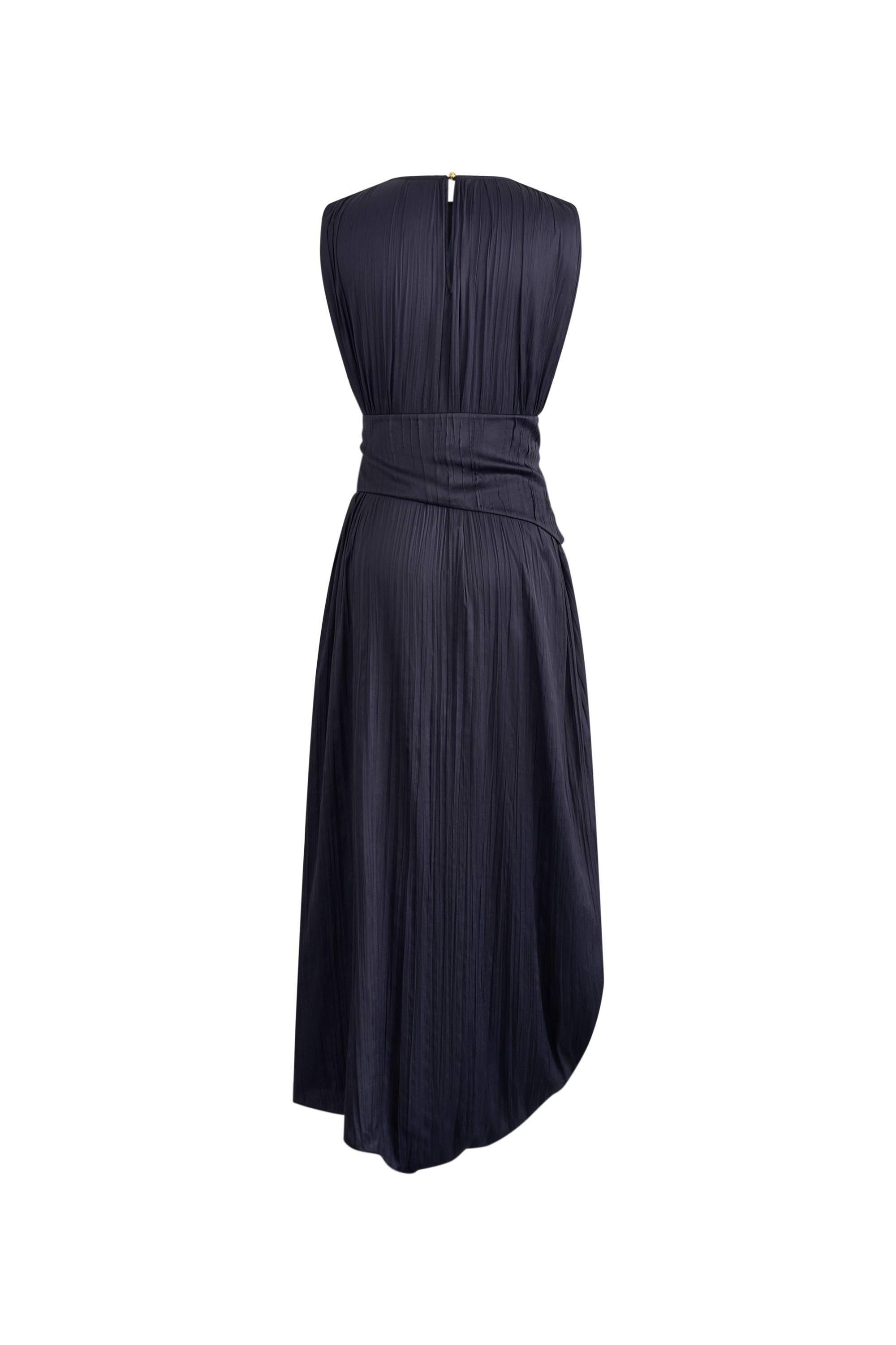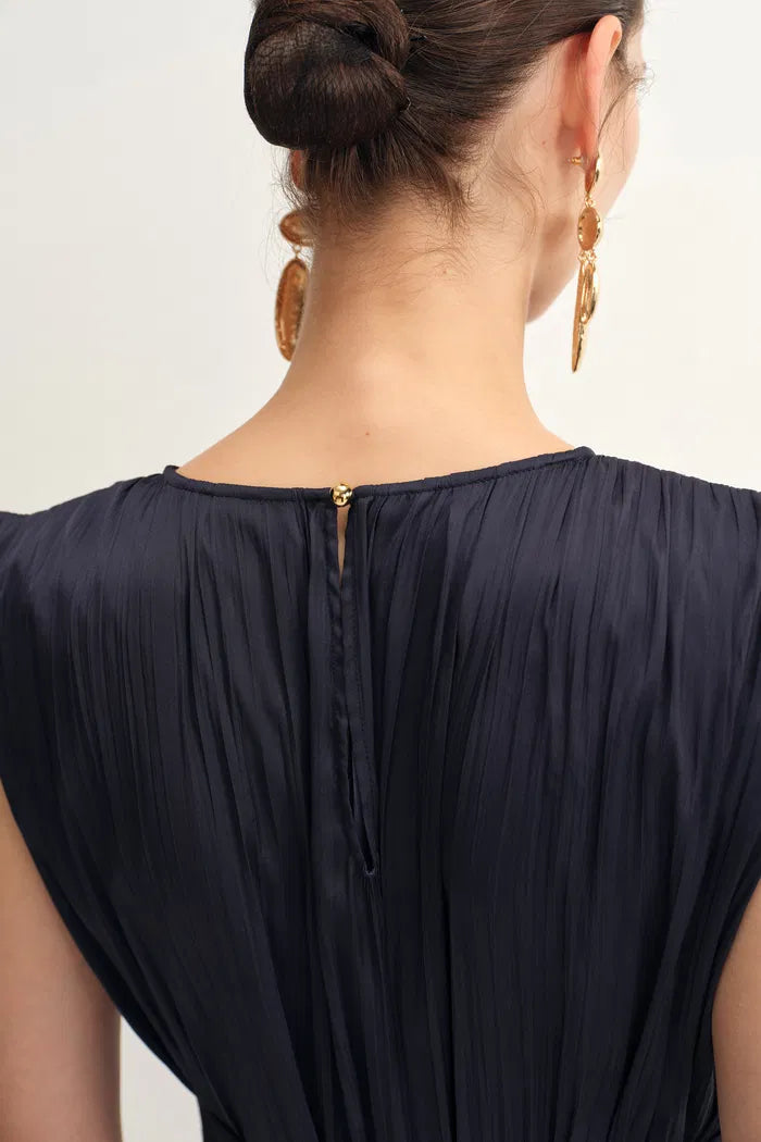 Celeste Sleeveless Navy Dress in Pleated Satin