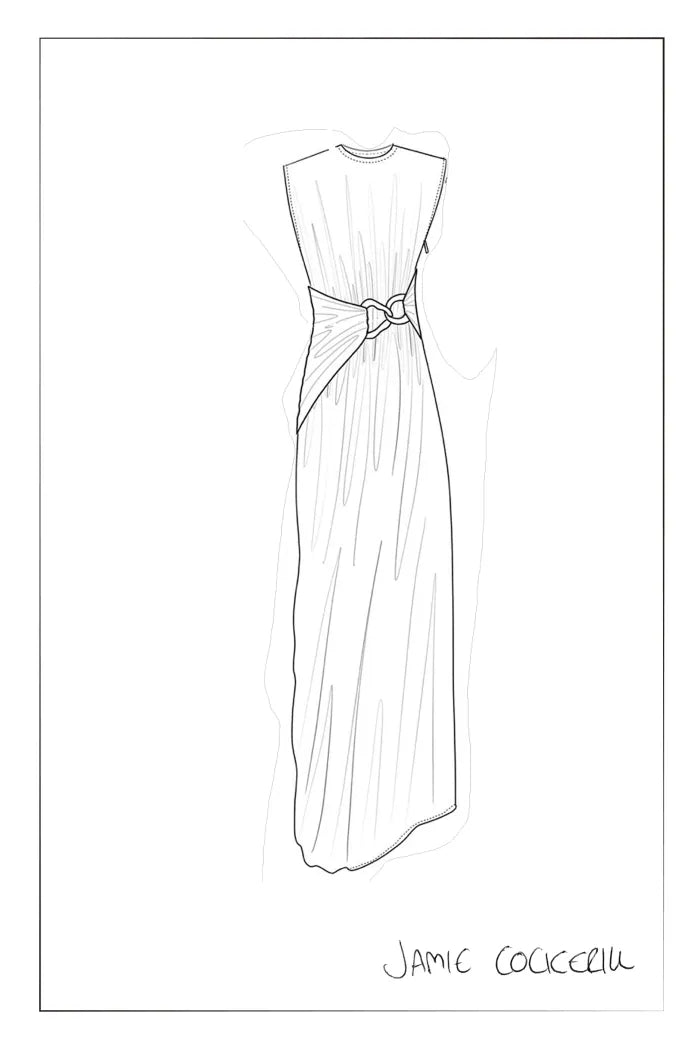 Custom metallic belt buckle adds sculptural, modern artistic appeal.