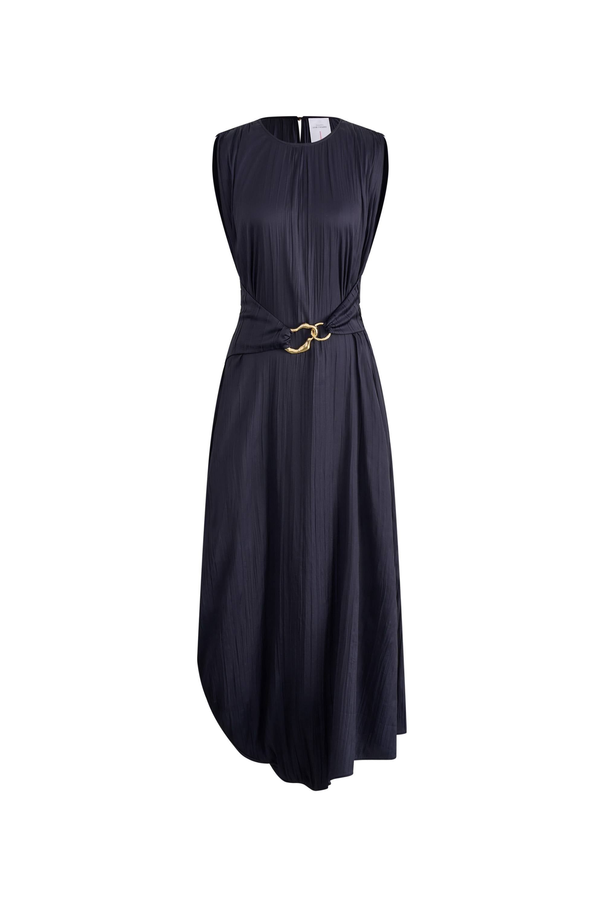 This boat-neck dress intelligently combines pleated satin with stretch. Curved hem creates an artistic silhouette while the custom metal belt adds sculptural interest. Midnight navy feels both classic and current.