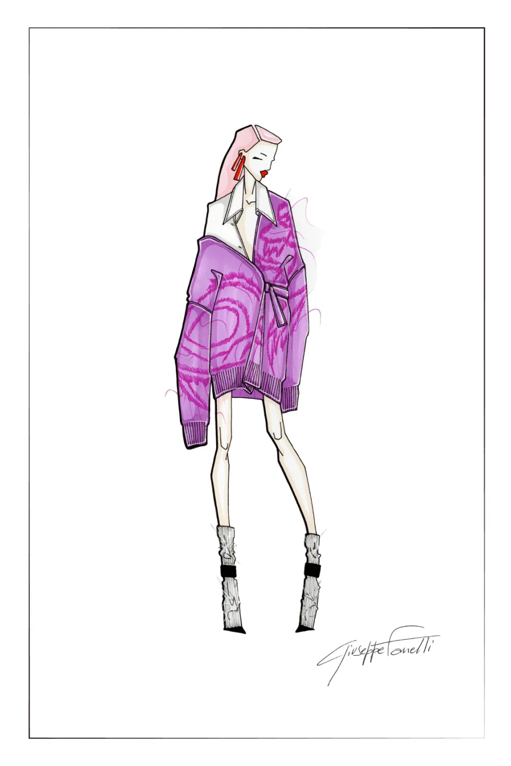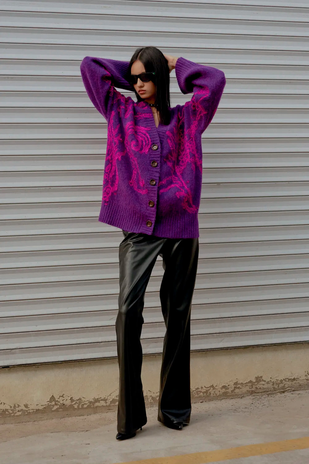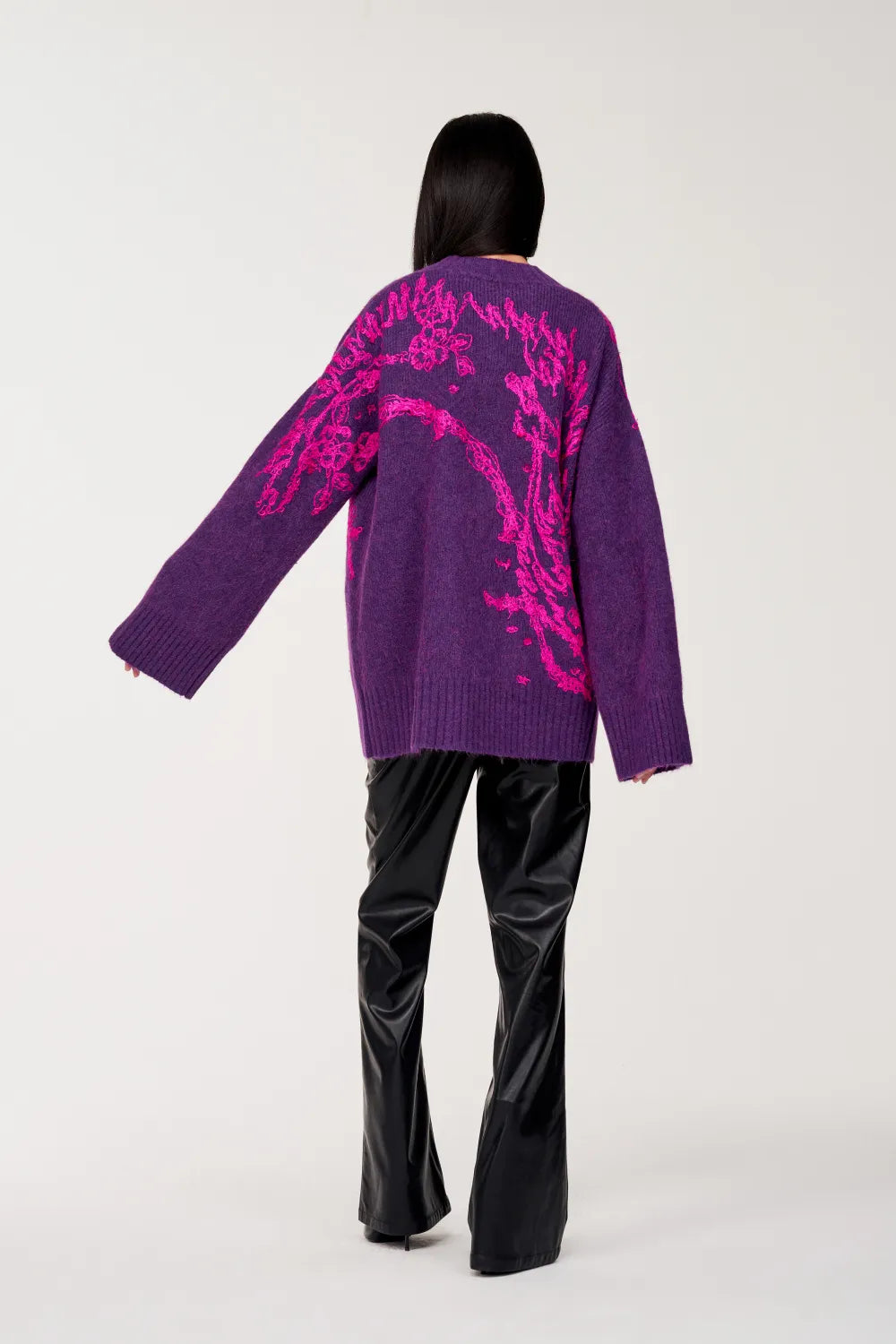 甄选含有羊驼毛与羊毛纤维的混纺纱线,触感丰润蓬松的同时衬托绣花工艺,上身倍感柔软亲肤,给予身体温暖穿着体验,浓郁的高饱和凝夜紫色,微微混色效果与亮粉色撞色绣花,点亮整体,多巴胺色彩点亮沉闷心情,带来好运祝福。