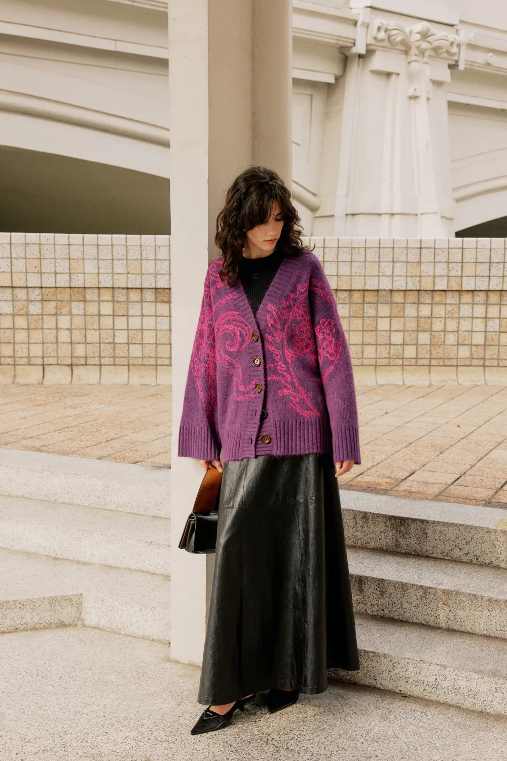 Darcy 凝夜紫彩龙穿花羊驼毛混纺绣花针织开衫