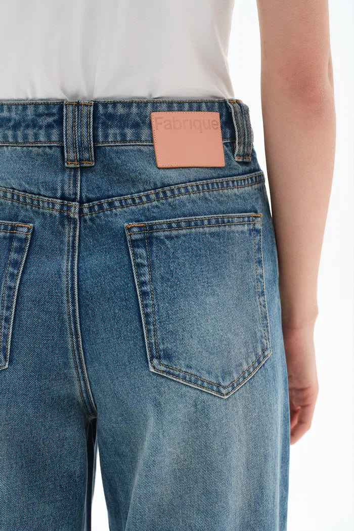 Pure cotton denim. Water-washed for soft drape while maintaining structure. Leg-slimming fit. Natural whisker fading in classic indigo.