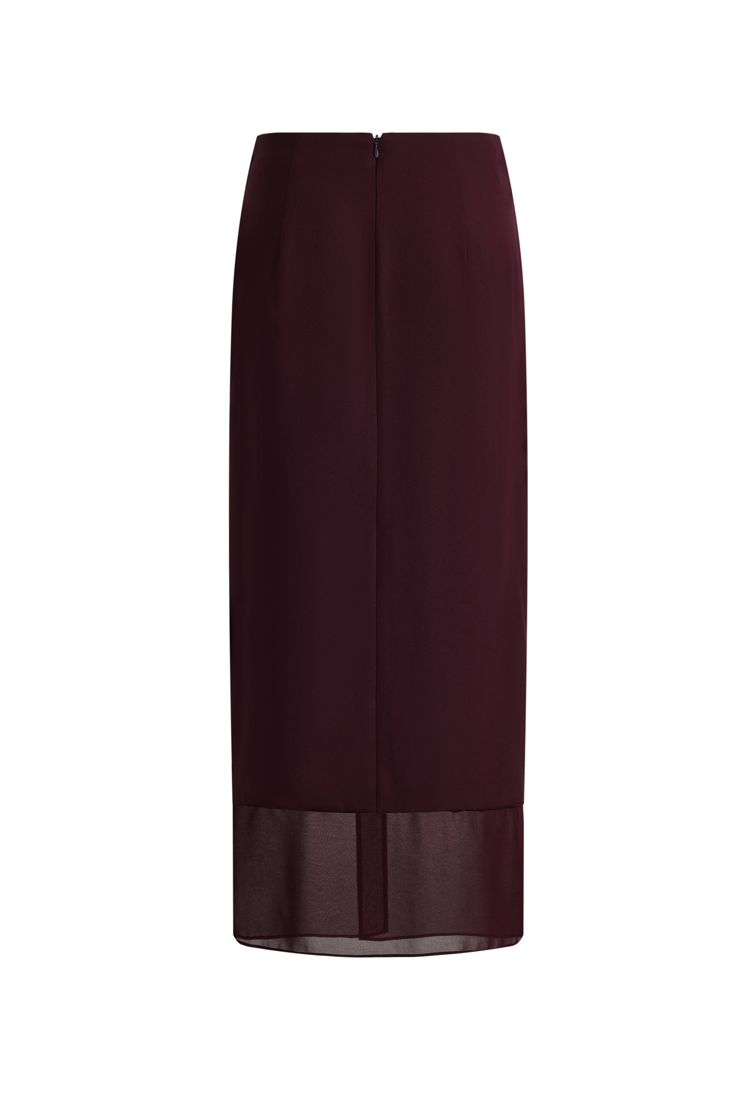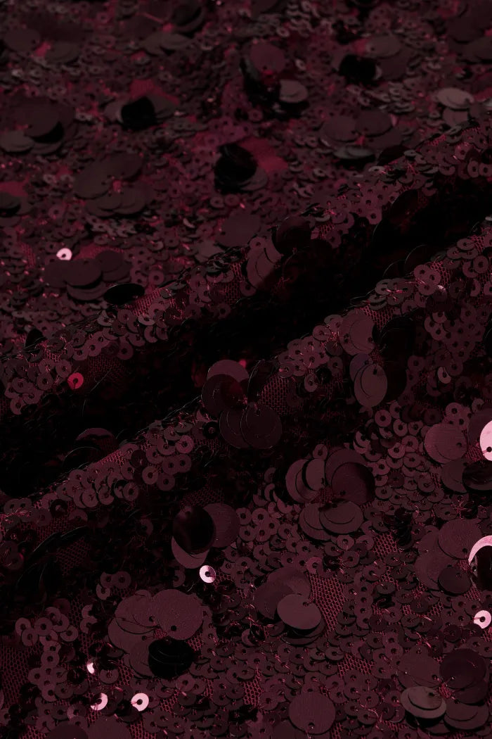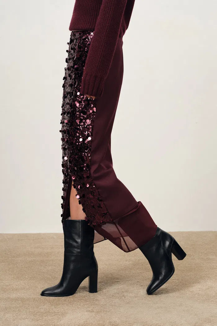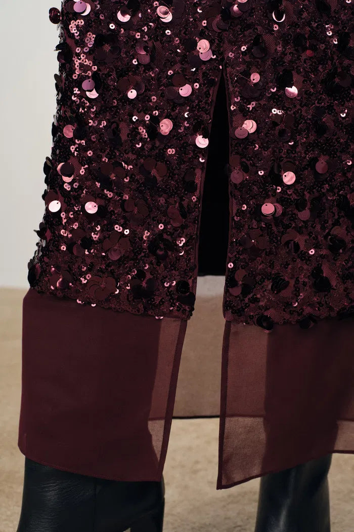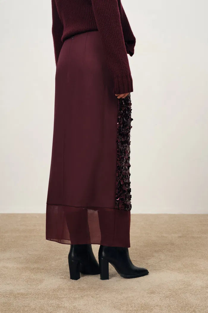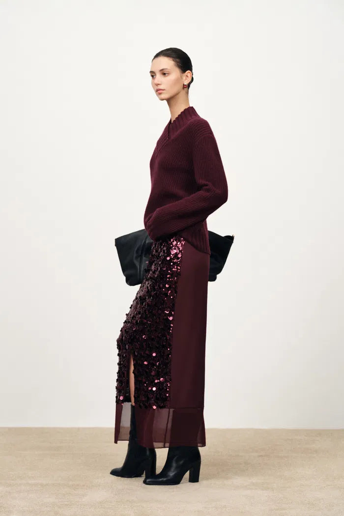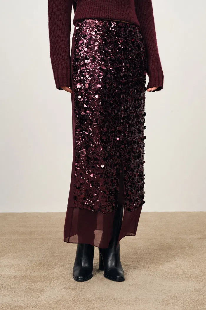 A sequin skirt made for the spotlight. Burgundy sequins fade into soft tulle at the hem, creating a mix of structure and lightness. It’s the kind of piece that makes dressing up feel natural.