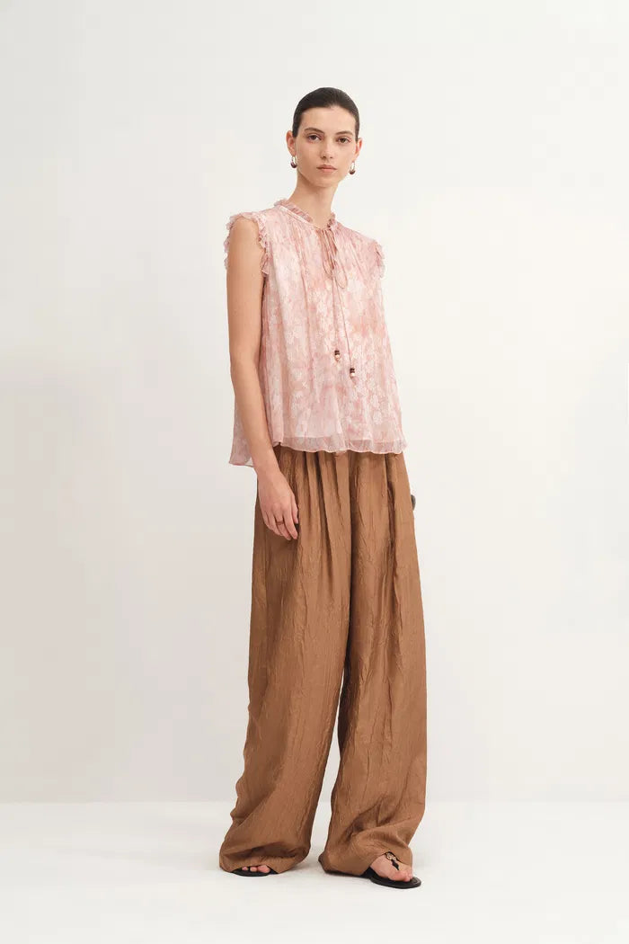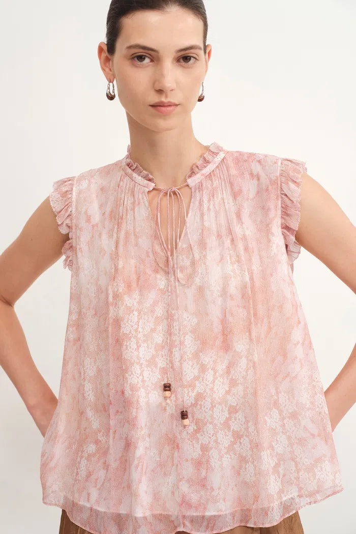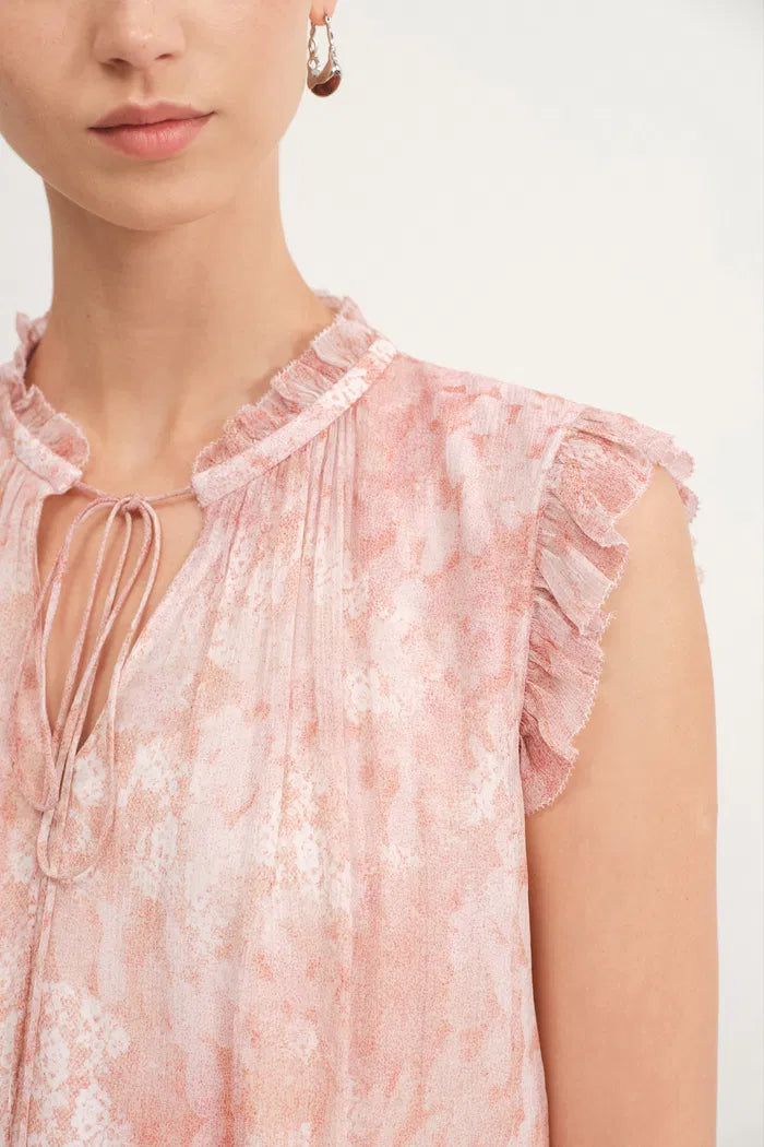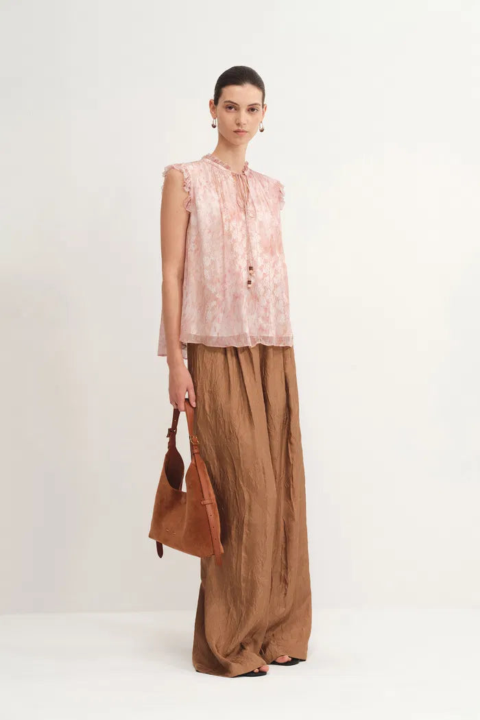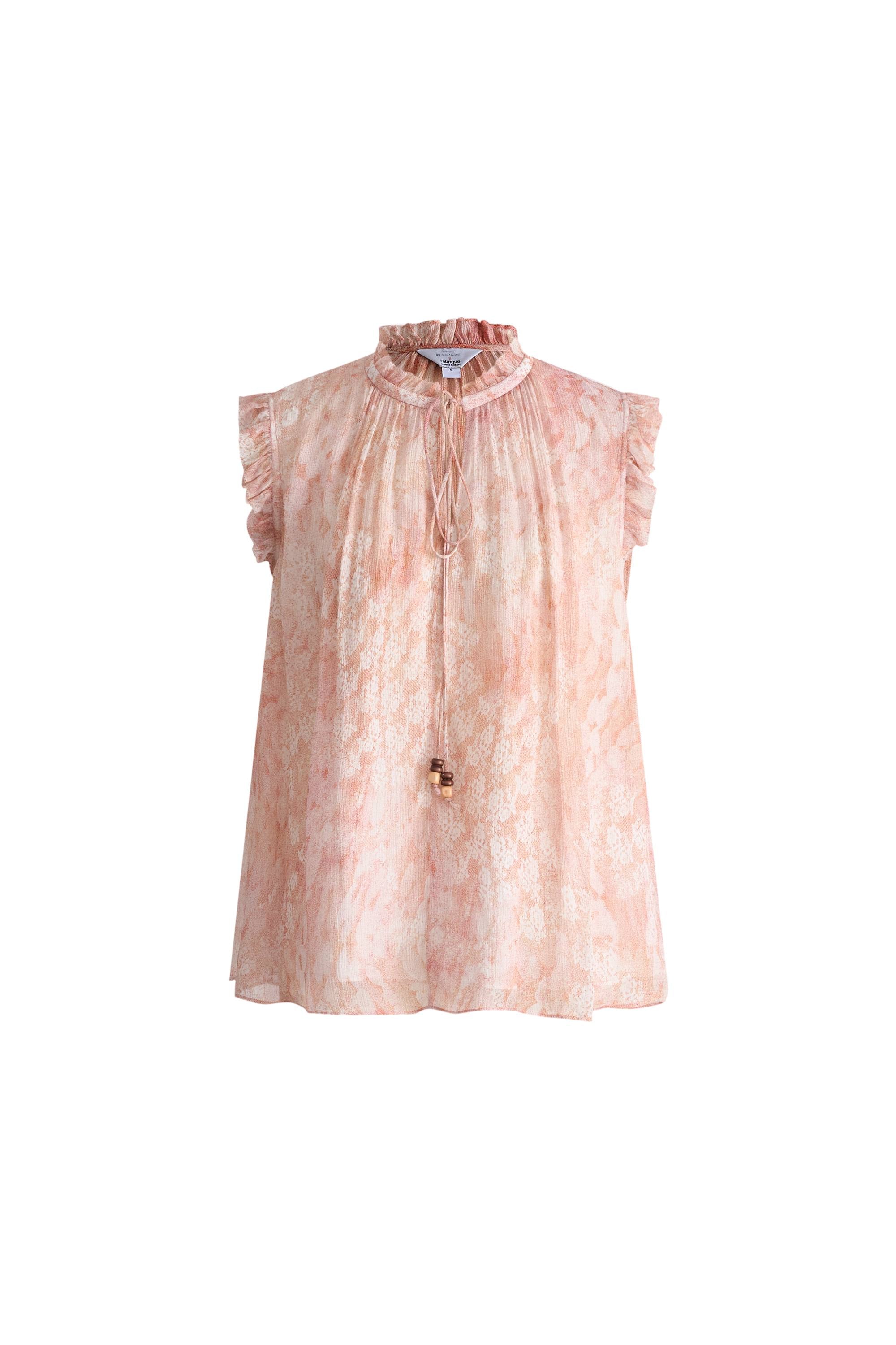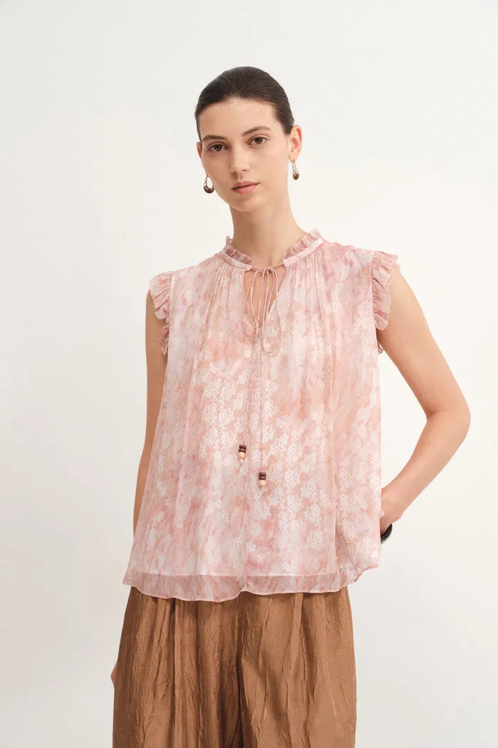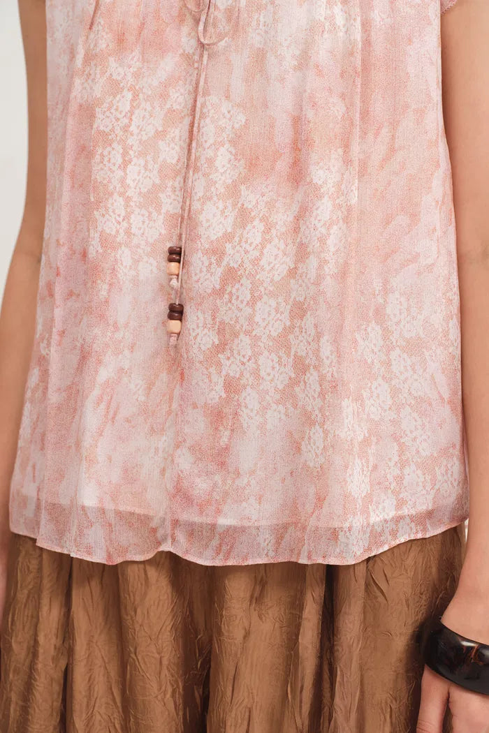 This Gracia sleeveless blouse features tie-neck styling and wooden bead details that catch the light subtly. Hand-painted peachy florals bloom across crinkled georgette, while the relaxed fit ensures comfort. Your new favorite for vacation and beyond.