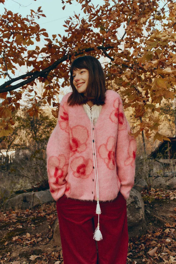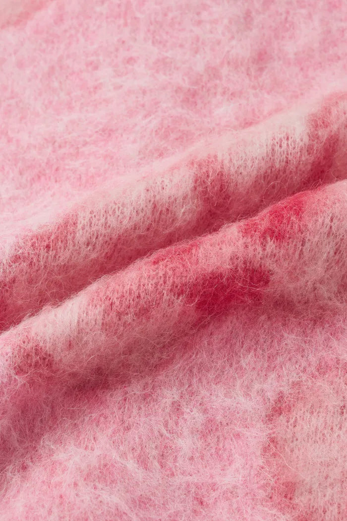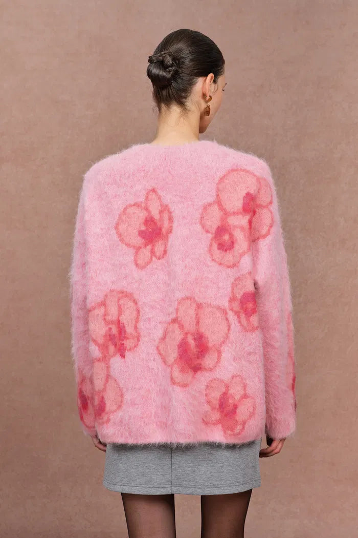Gentle orchid blooms woven in brushed alpaca yarn, capturing the softness of first light. The blush-pink hue lifts the complexion, while its airy, oversized cut drapes with quiet elegance — light, warm, and delicately tactile.