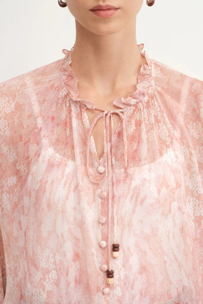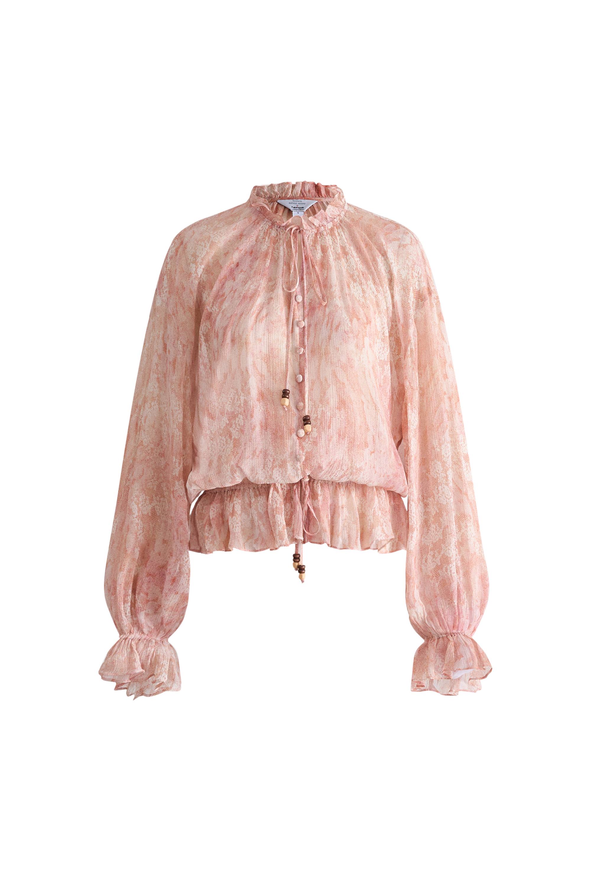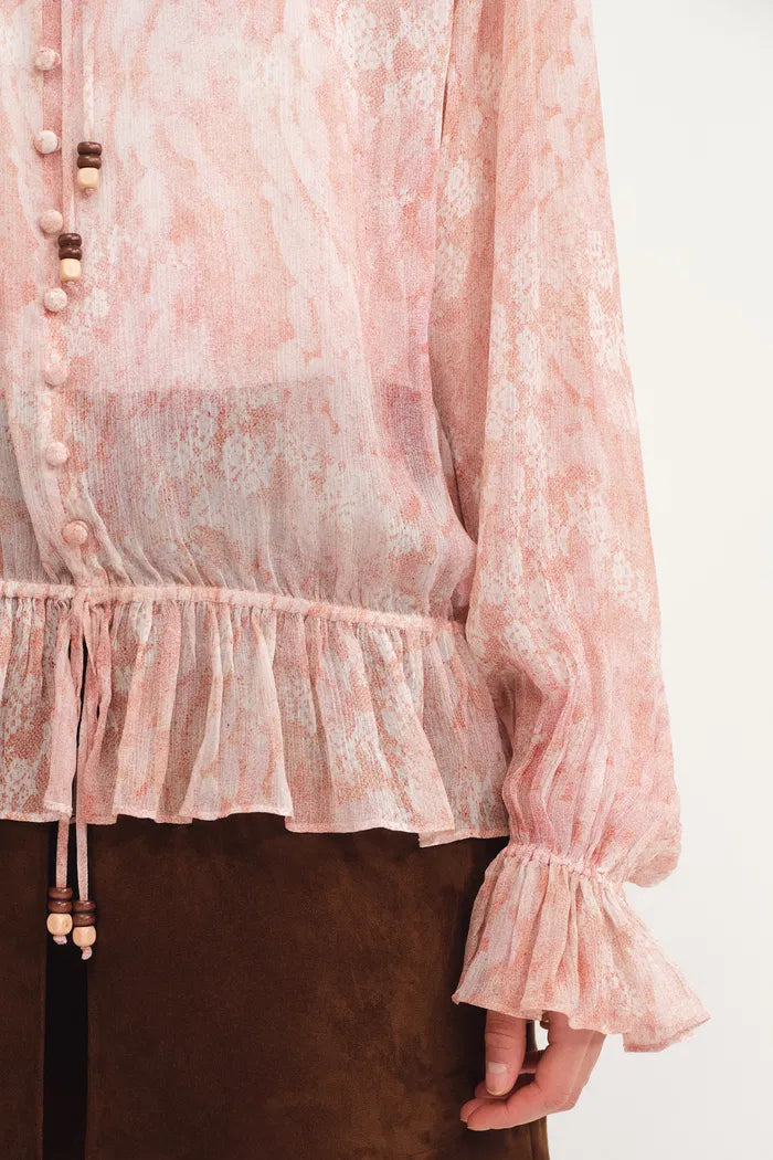 This Kelena blouse combines tie-neck romance with balloon sleeves for dreamy proportion. Hand-painted florals dance across crinkled fabric, while wooden bead details add bohemian charm. The elastic waist ensures comfortable fit throughout the day.