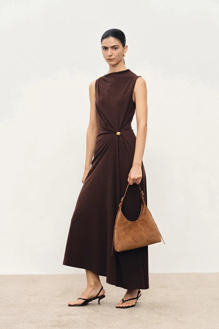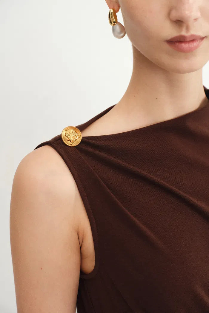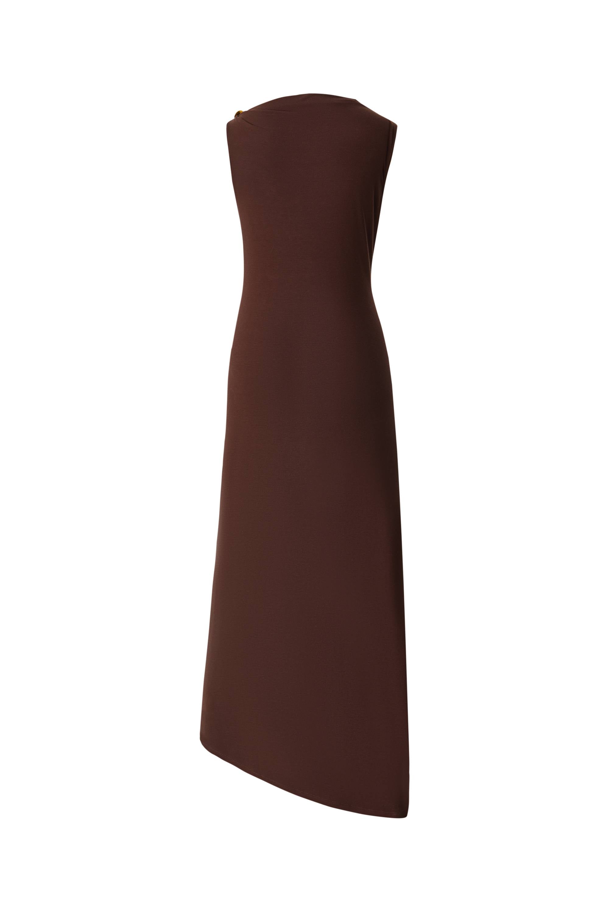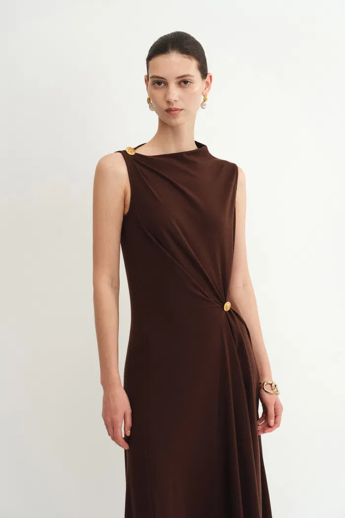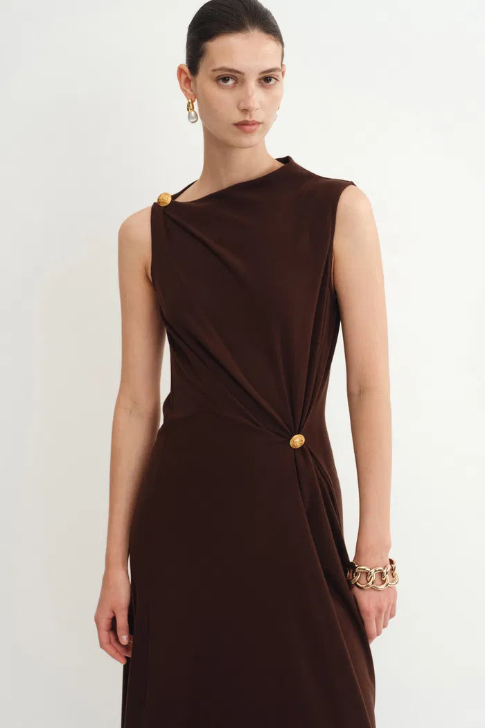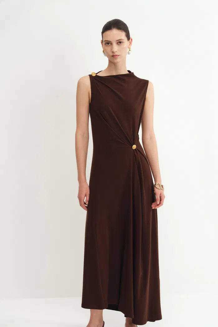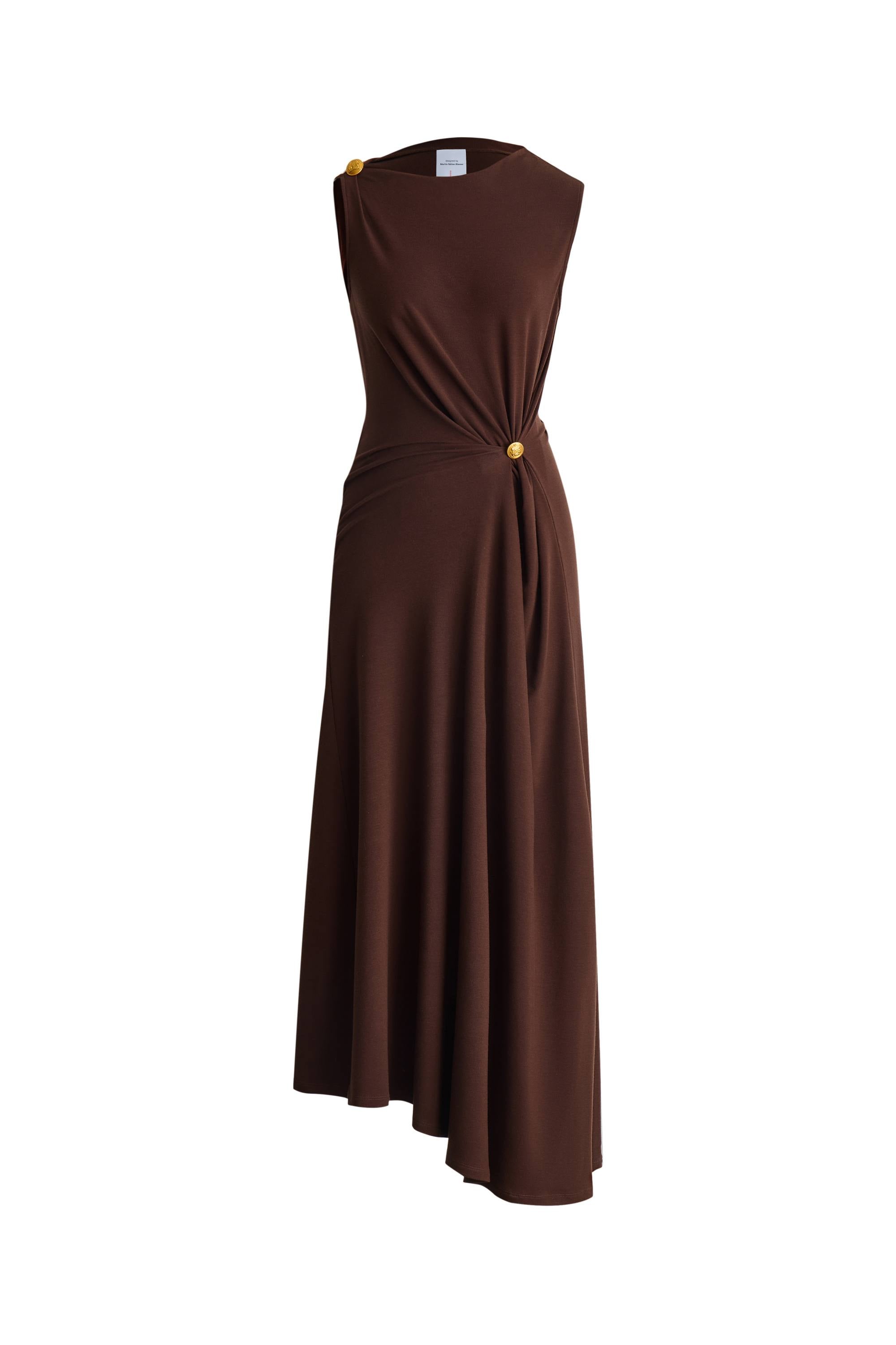 With clever pinched waist pleating and asymmetrical hem, this Kiki dress creates Greek goddess elegance. The stretch knit fabric moves beautifully with your body, while decorative metal buttons add modern glamour. A true statement piece for memorable occasions.