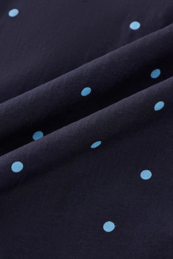 This Nora skirt pairs dense tuck pleats with a full, swinging hemline. Navy background with light blue polka dots creates vintage charm with modern proportion. The linen blend holds its shape while remaining breathable—your new favorite for both casual and dressed-up occasions.