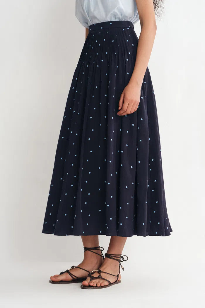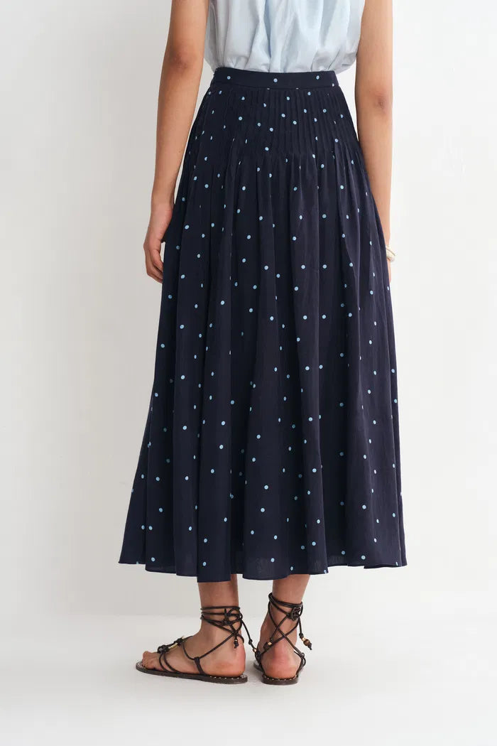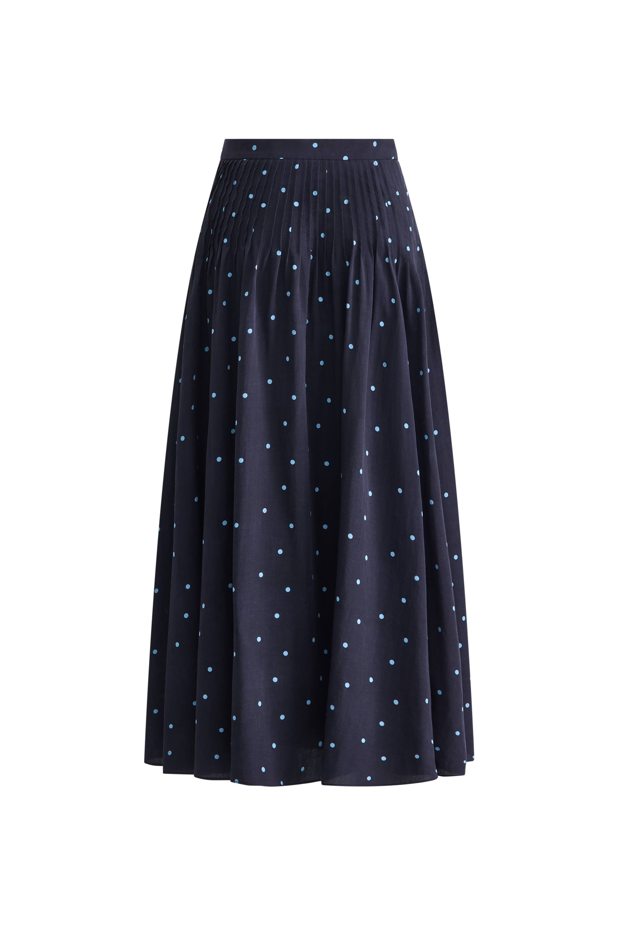 This Nora skirt pairs dense tuck pleats with a full, swinging hemline. Navy background with light blue polka dots creates vintage charm with modern proportion. The linen blend holds its shape while remaining breathable—your new favorite for both casual and dressed-up occasions.