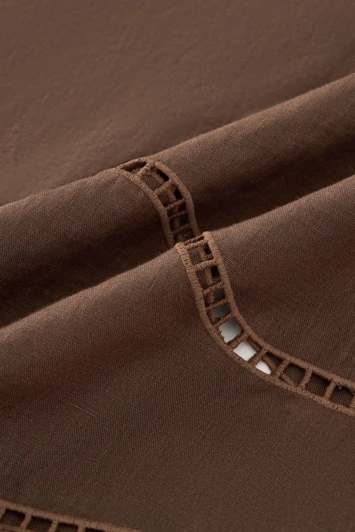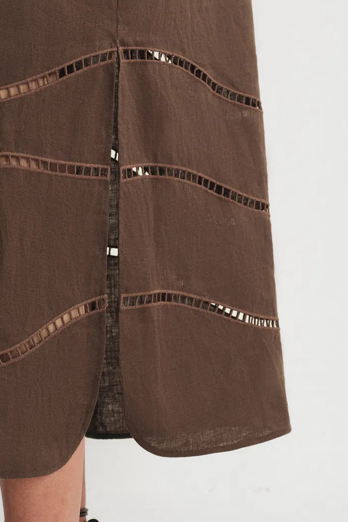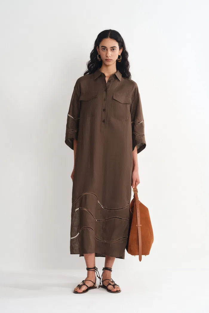 This Riley dress brings wave-inspired embroidery to relaxed linen styling. Curved sleeves echo ocean movement, while side slits ensure easy walking. In rich mocha brown that pairs beautifully with everything from sandals to statement jewelry.
