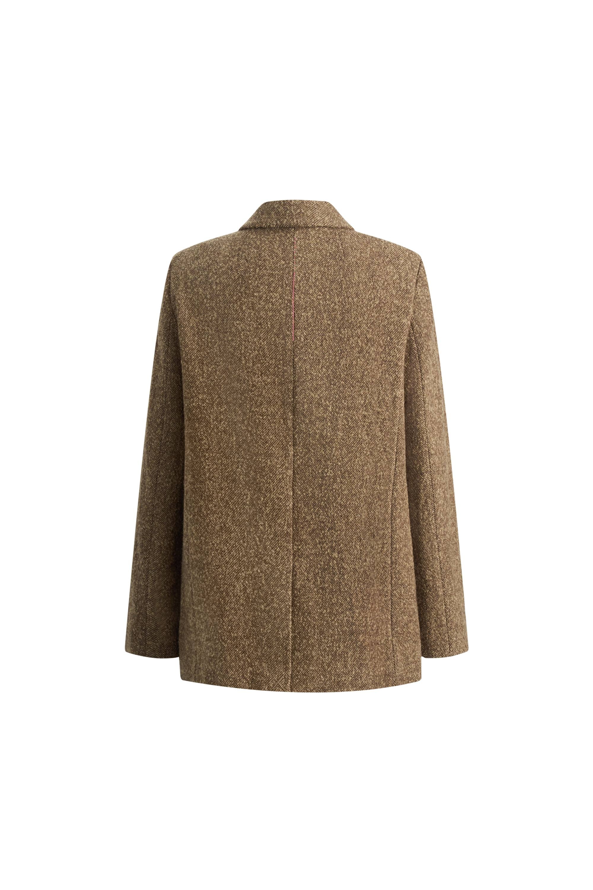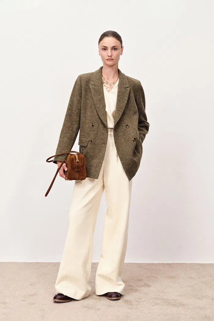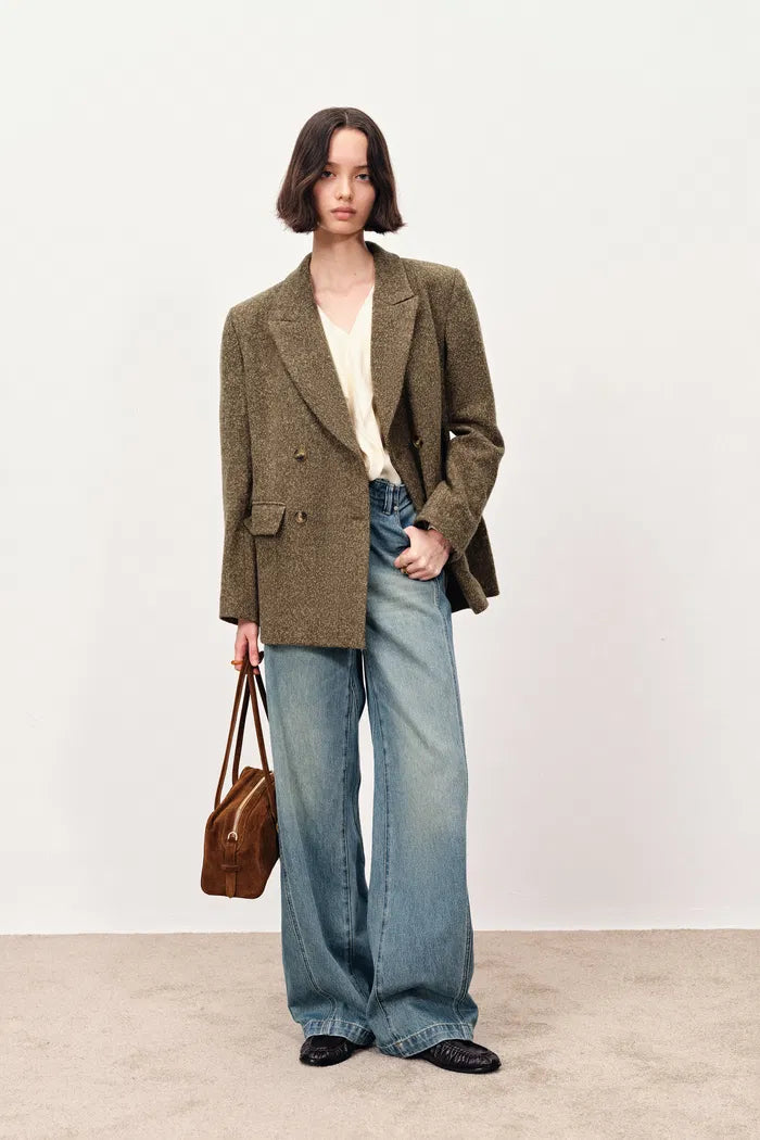 Loop-textured herringbone creates warmth without bulk, perfect for office air conditioning. Moss-green reads as sophisticated neutral while peak lapels add authority without looking intimidating in meetings.