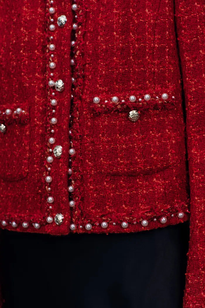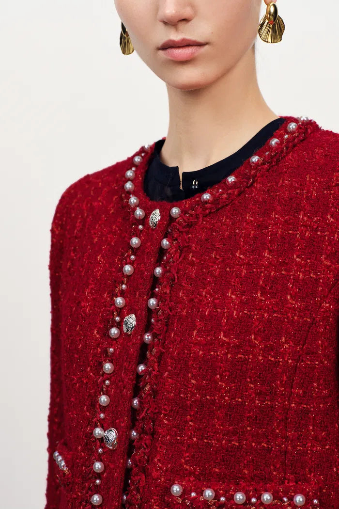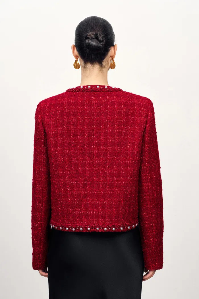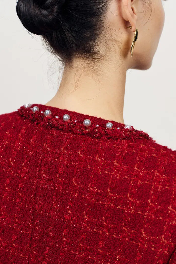 A red tweed jacket that owns the spotlight. With beaded trims and structured shoulders, it brings couture energy to everyday dressing. Pair it with denim or trousers either way, it commands attention effortlessly.