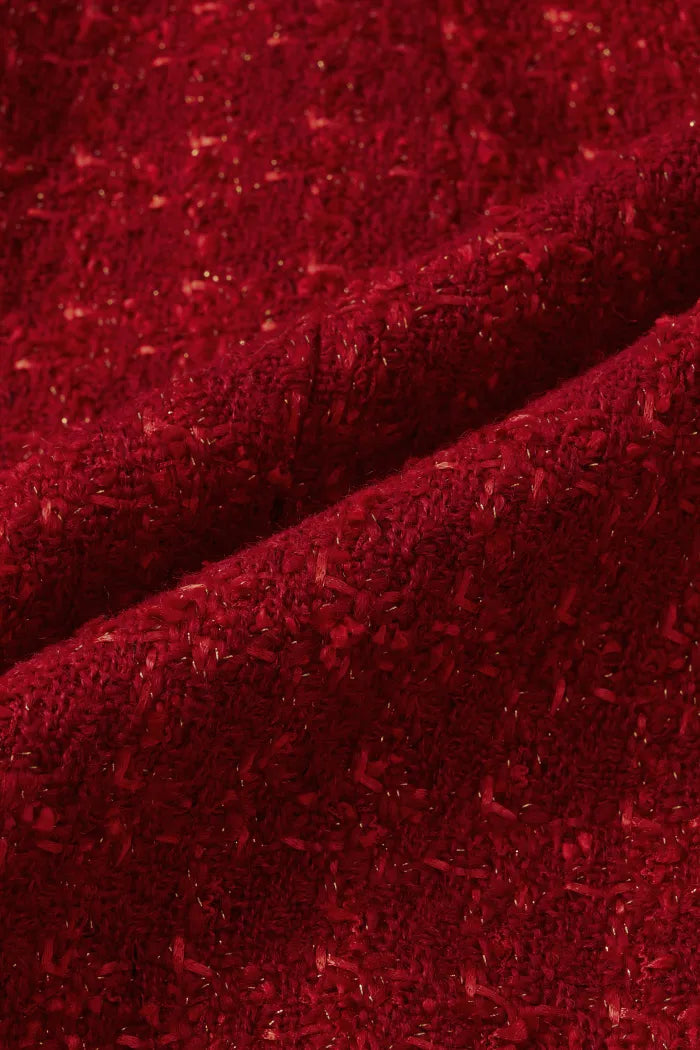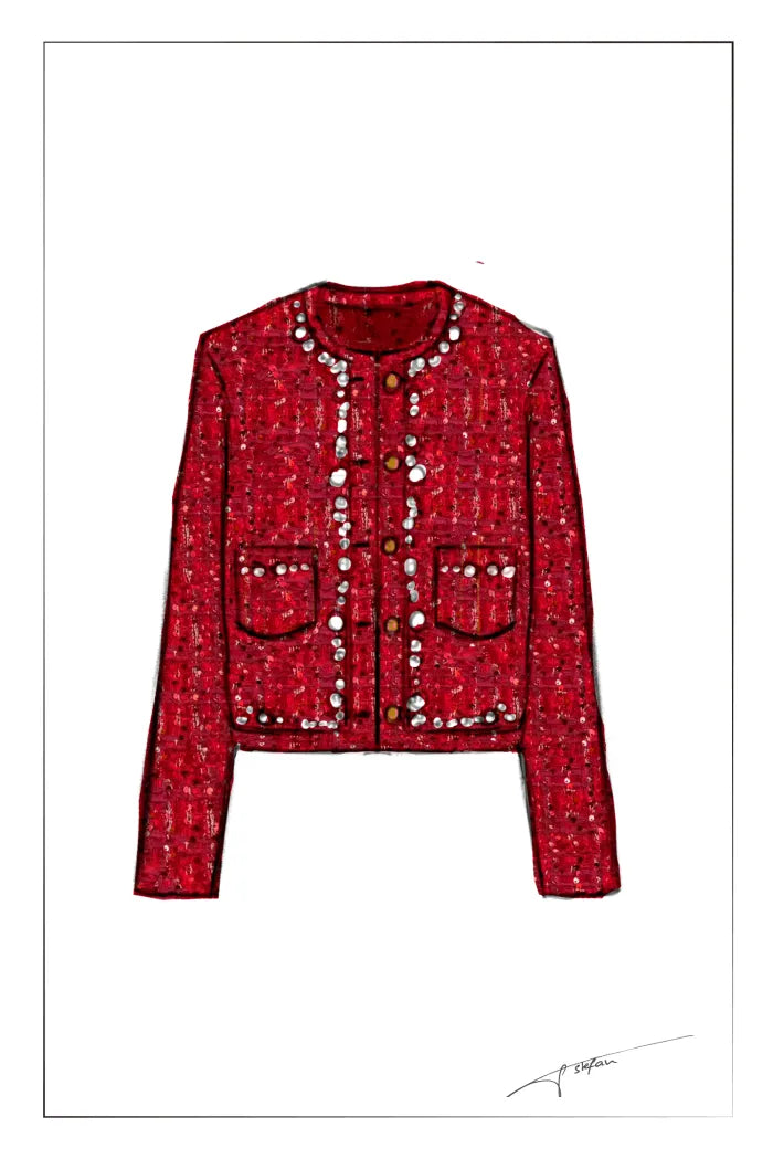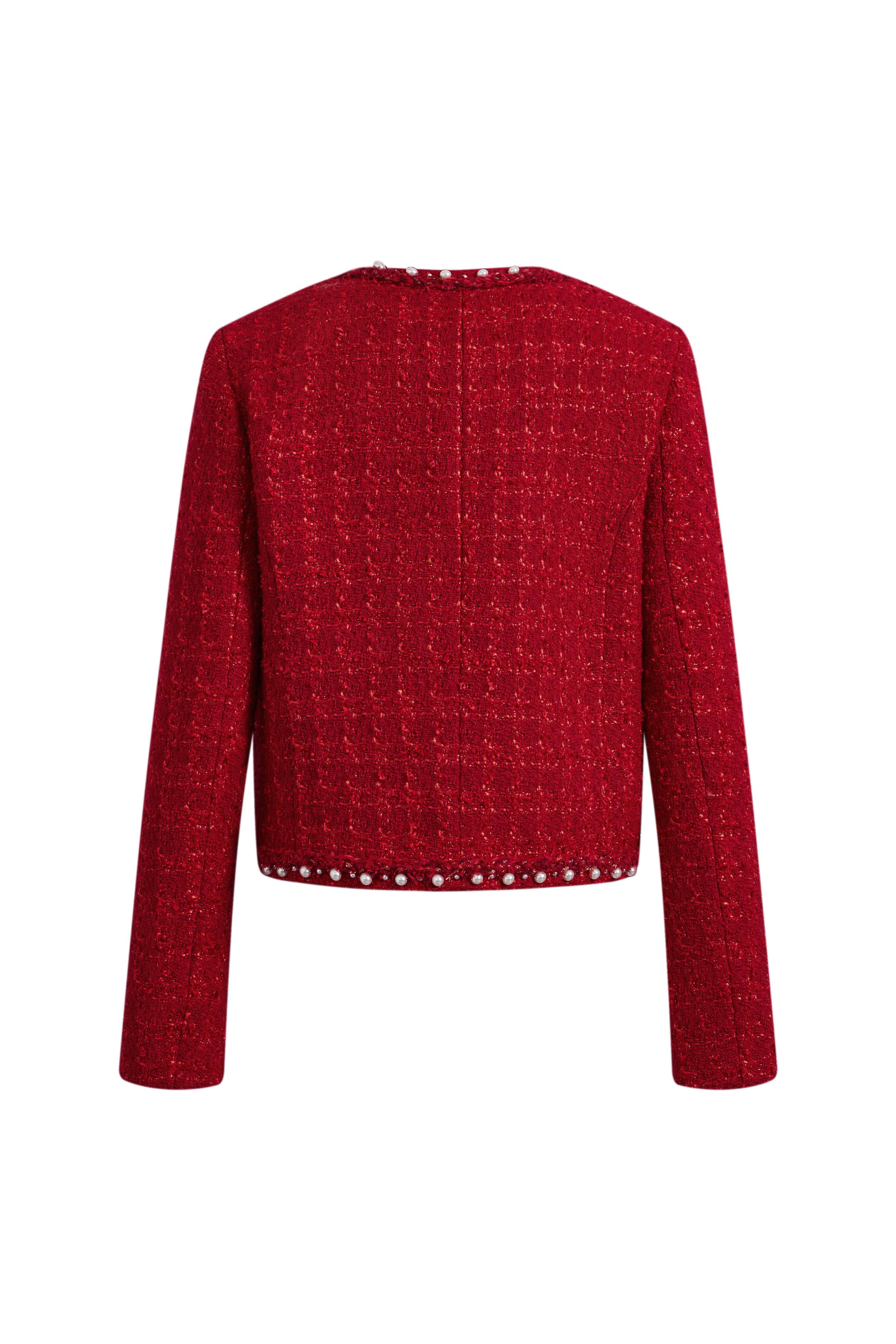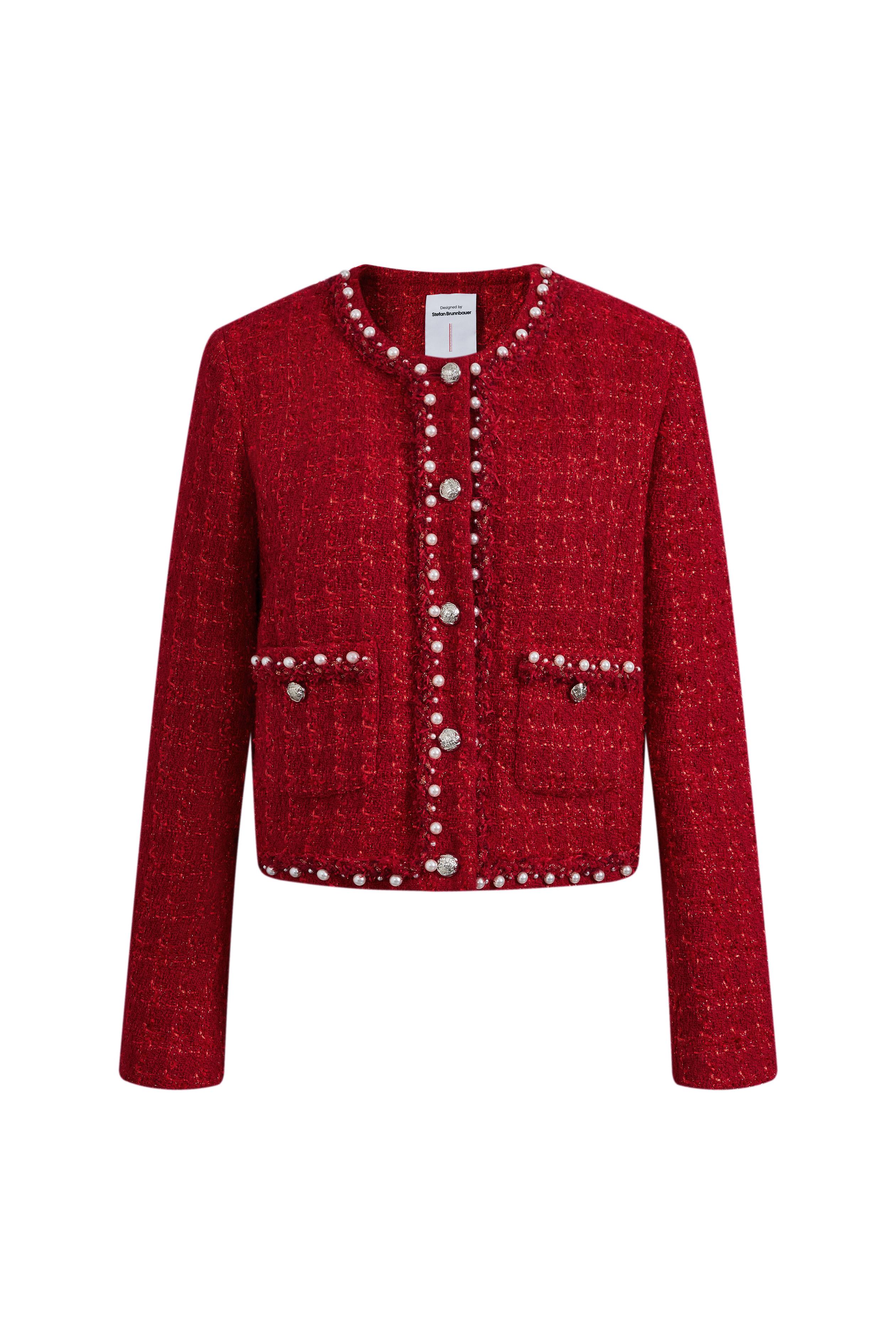 A red tweed jacket that owns the spotlight. With beaded trims and structured shoulders, it brings couture energy to everyday dressing. Pair it with denim or trousers either way, it commands attention effortlessly.
