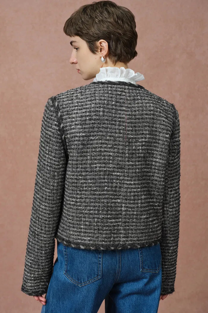 Silver crest buttons elevate the tweed with a classic Parisian touch.