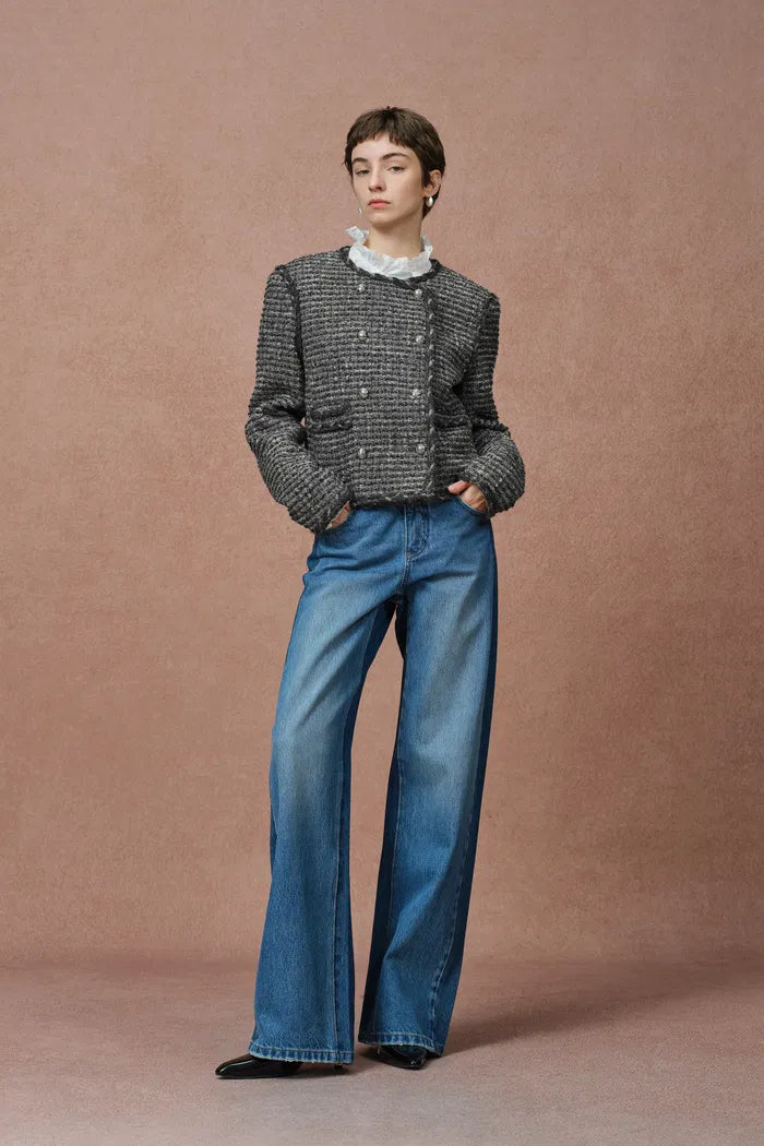 A tweed jacket with subtle metallic trims that offer just enough edge. The structured shoulders and soft grey palette make it a strong weekday staple that layers easily over simple basics.