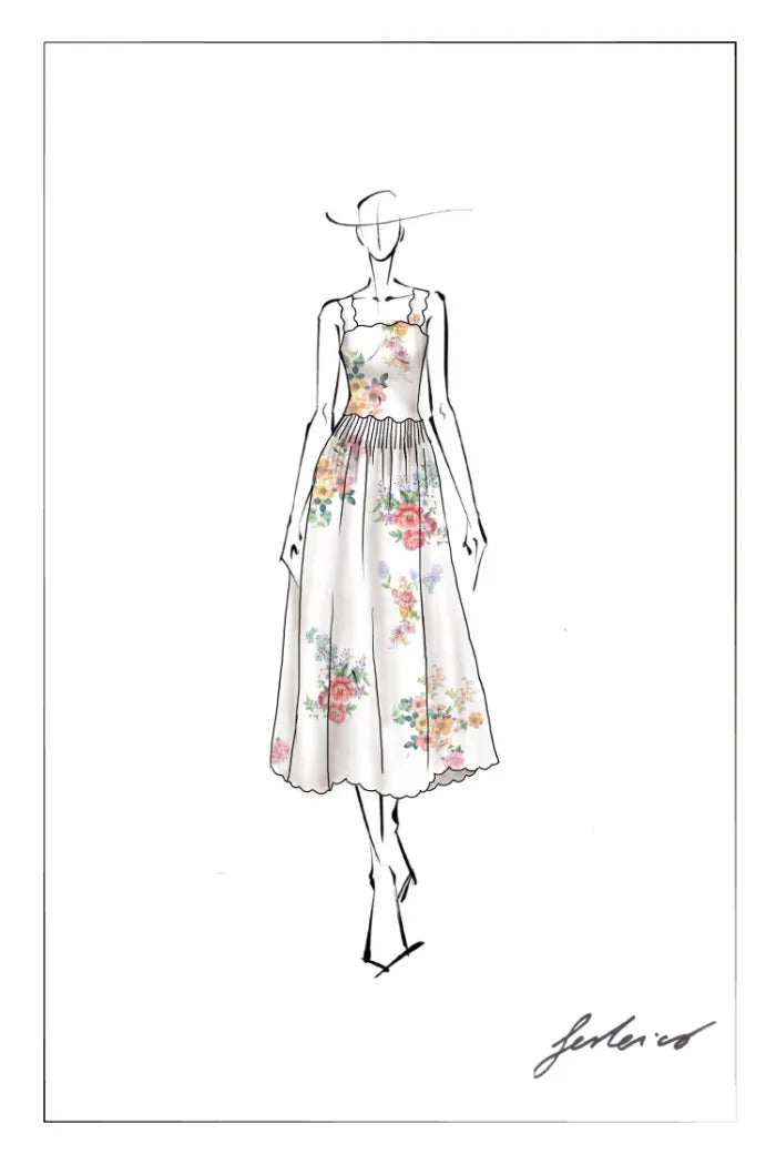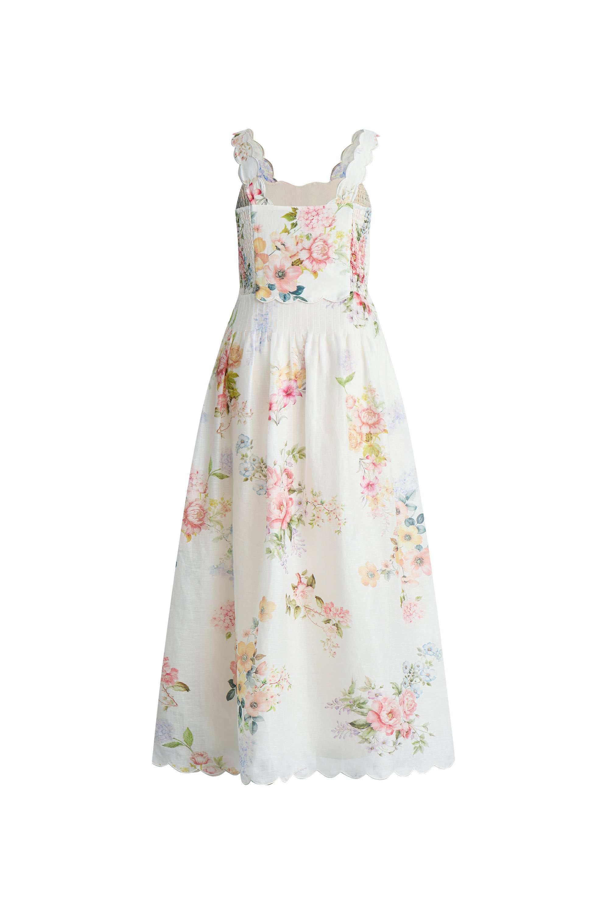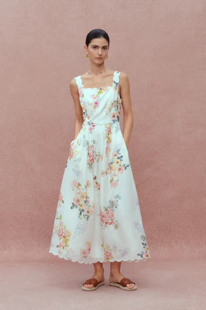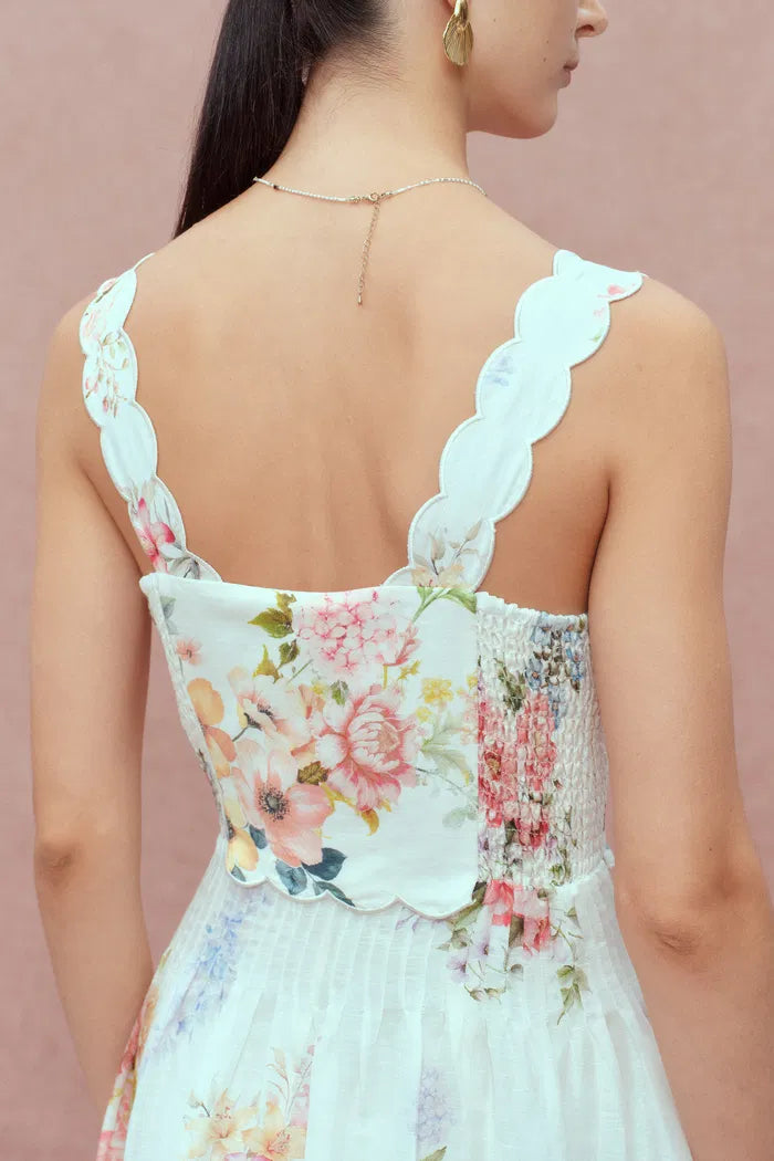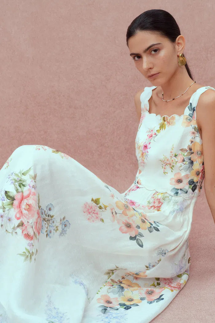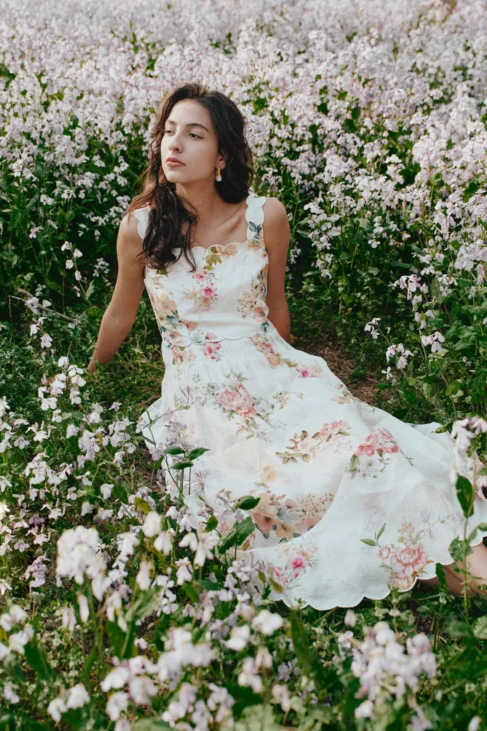 This embroidered dress pairs scalloped details with intelligent side smocking for a flattering fit. French square neckline adds sophistication, while tuck pleats define the waist without constriction. In our signature silk-linen with botanical prints, it brings garden-party vibes to any occasion.