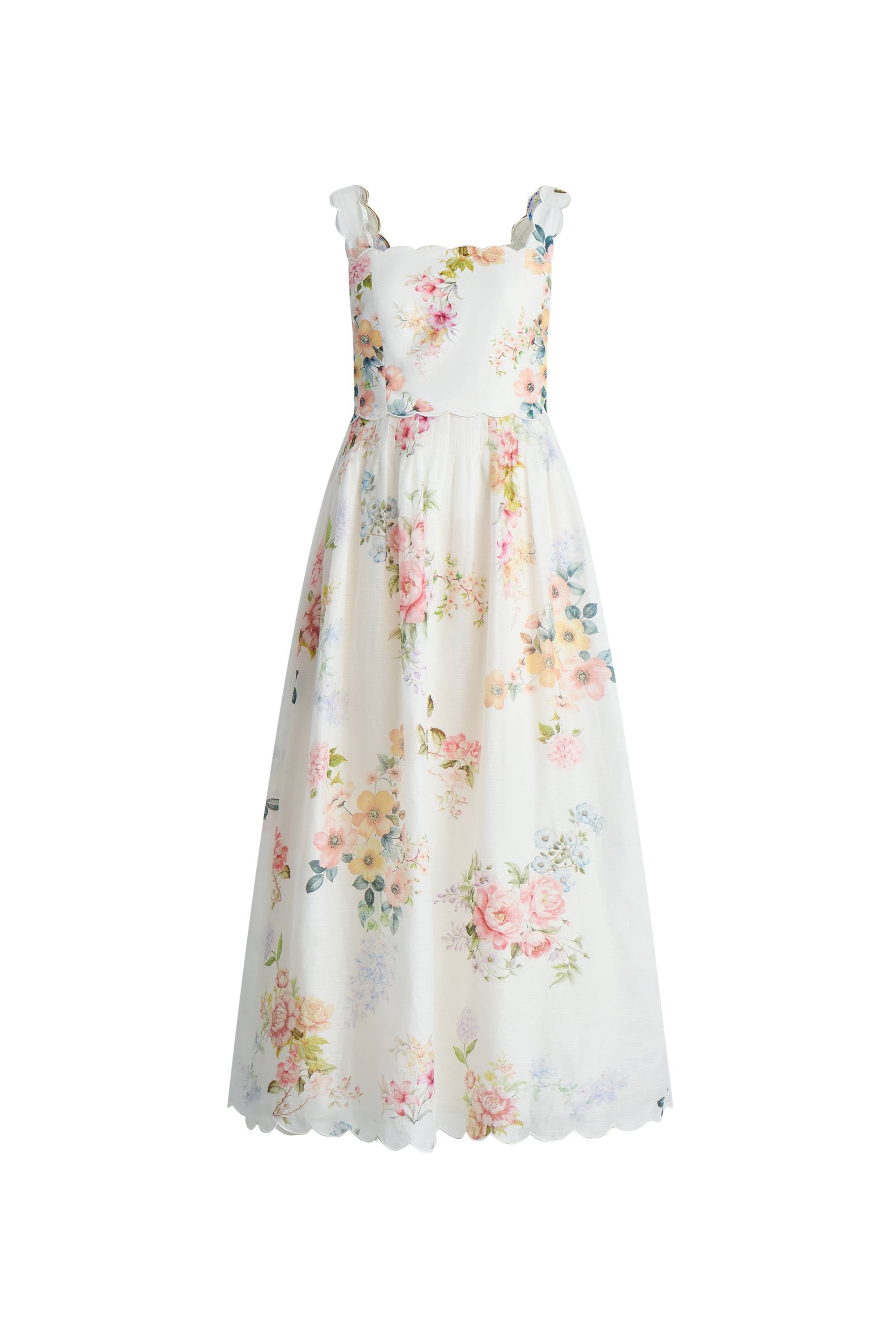 Xena Watercolor Flora Embroidery Strap Dress in Silk-Linen