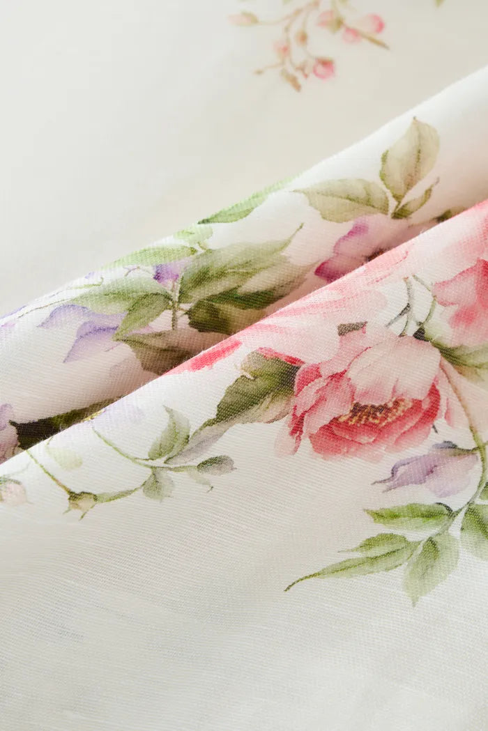Delicate watercolor prints of peonies, butterfly tulips, and larkspurs bloom across sheer silk-linen fabric. Natural slub texture like fine rain threads. The floral abundance feels alive, captured in a sea breeze ā like a seaside holiday dream come to life. Artistic, ethereal, vacation-ready.