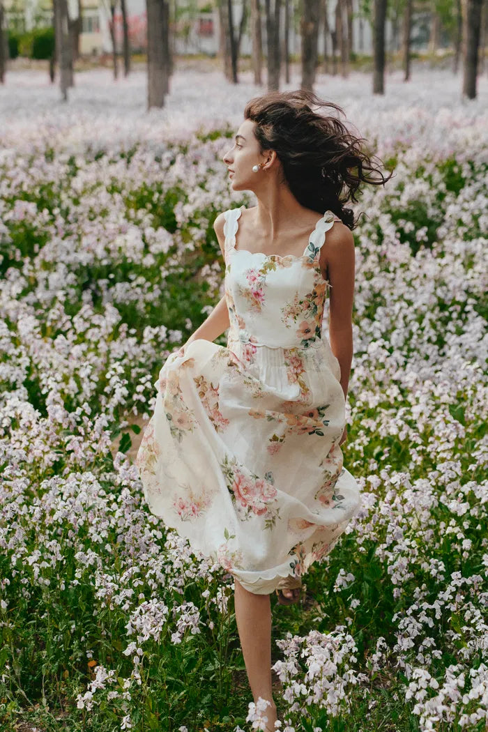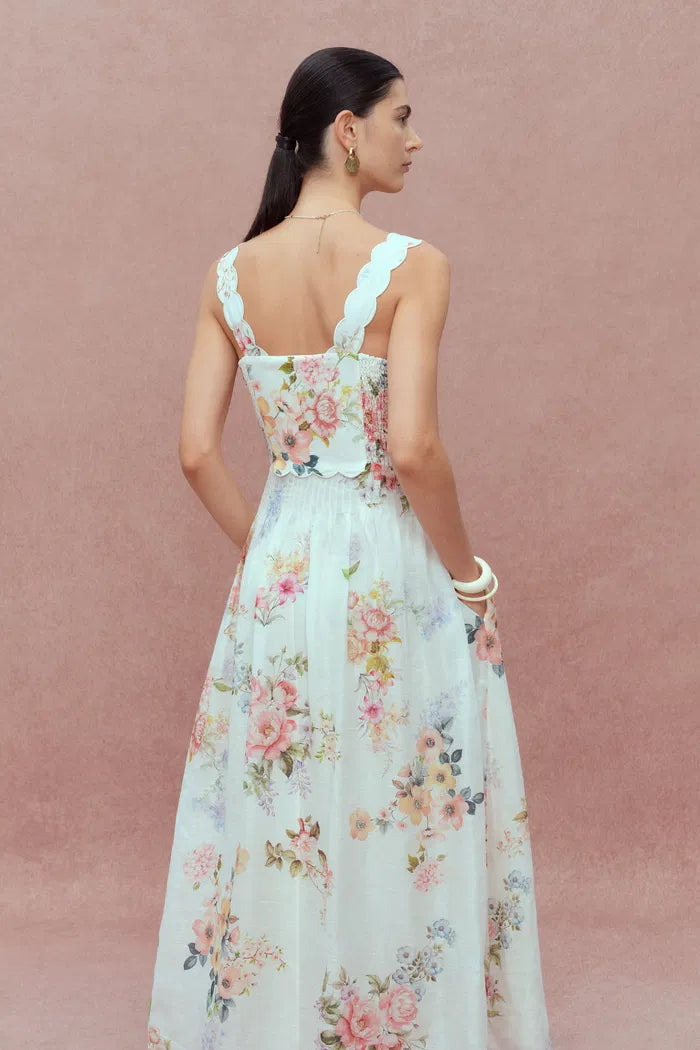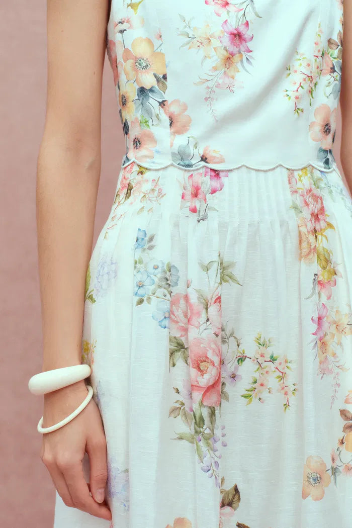 This embroidered dress pairs scalloped details with intelligent side smocking for a flattering fit. French square neckline adds sophistication, while tuck pleats define the waist without constriction. In our signature silk-linen with botanical prints, it brings garden-party vibes to any occasion.